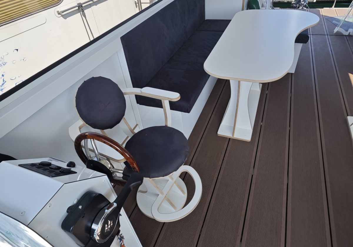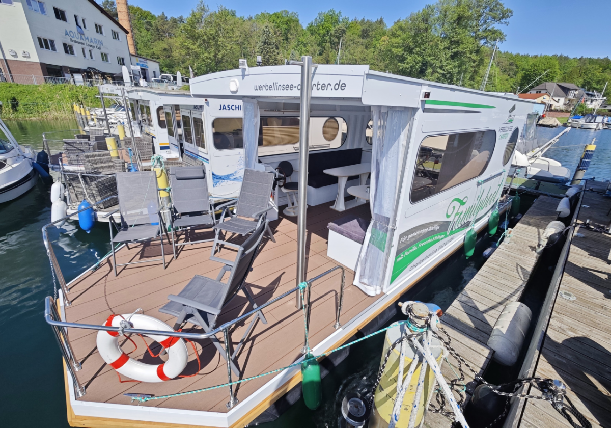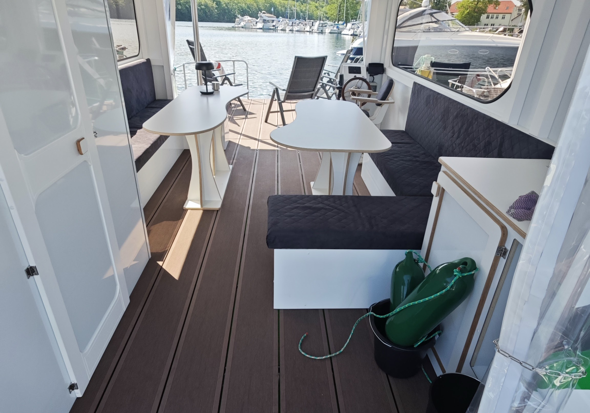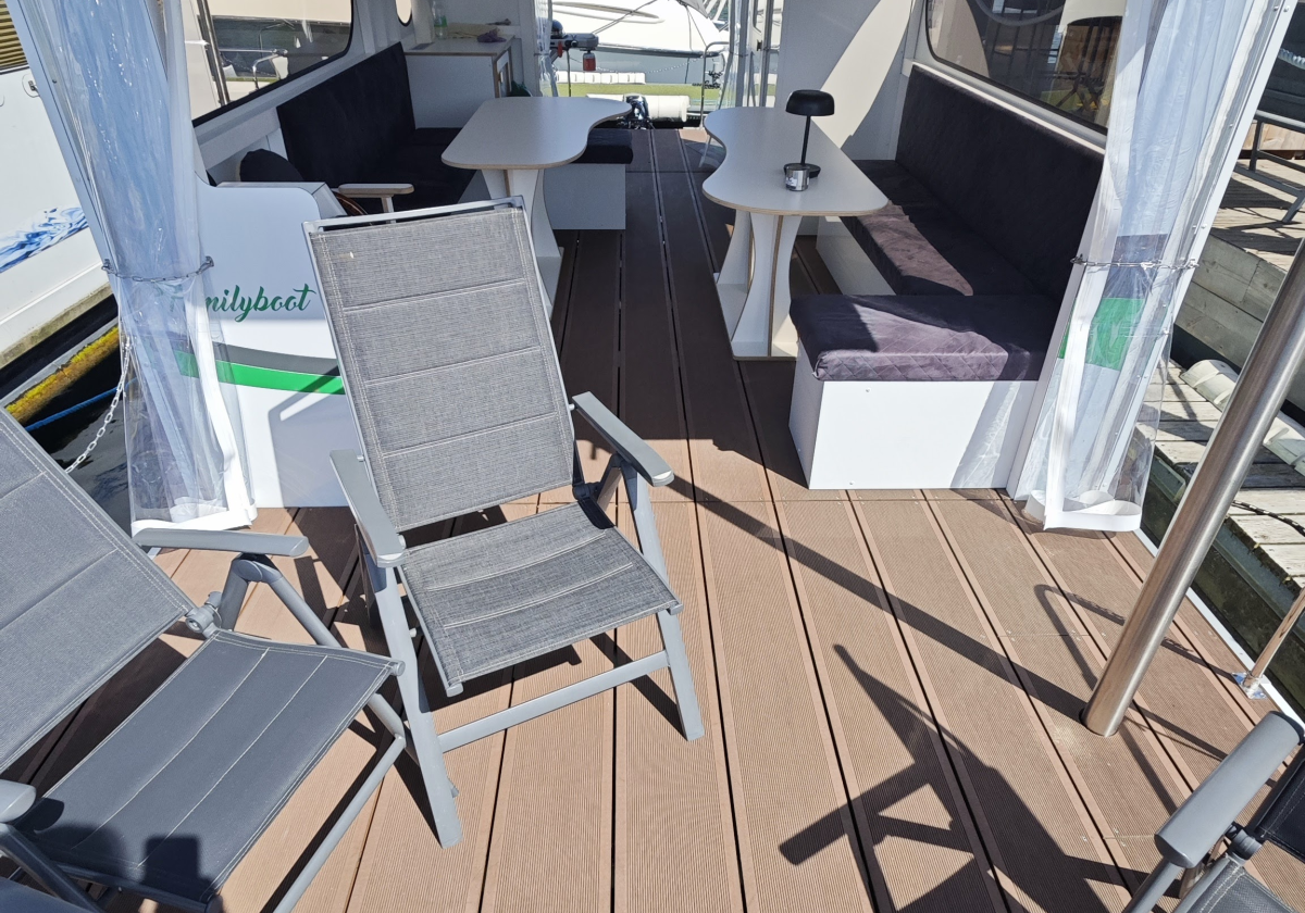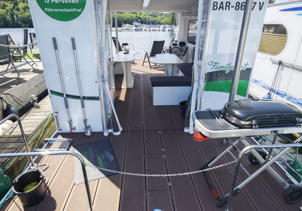 Ausstattung: bis 12 Personen, Toilette, Kühlschrank, Sonnen Terrasse, geschützer Innenraum, Badeleiter, 2 Ankerstangen für sicheren Halt, optional Gasgrill (Weber Traveler)