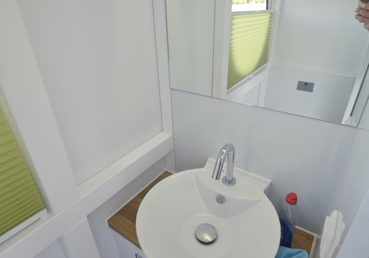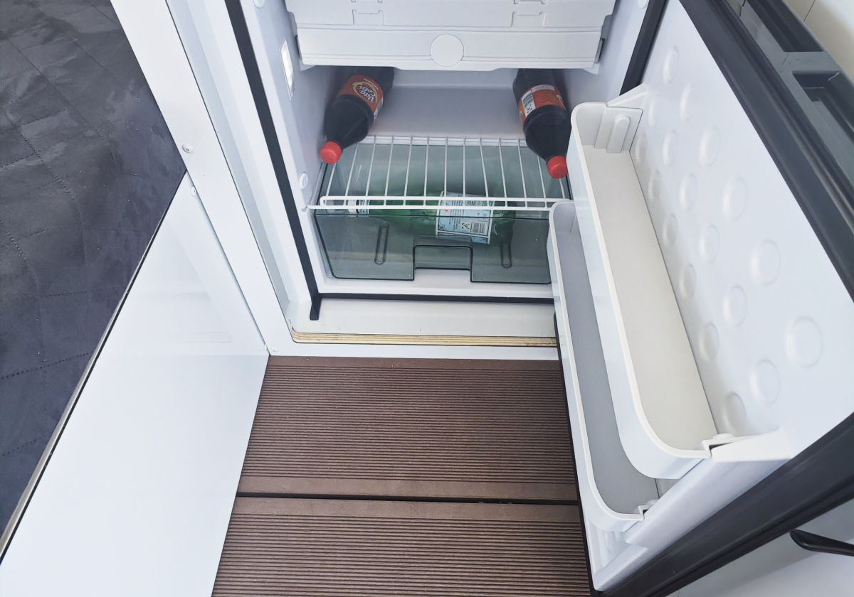 Natürlich verfügt unser Familyboot uber einen Kühlschrank und eine Toilette.