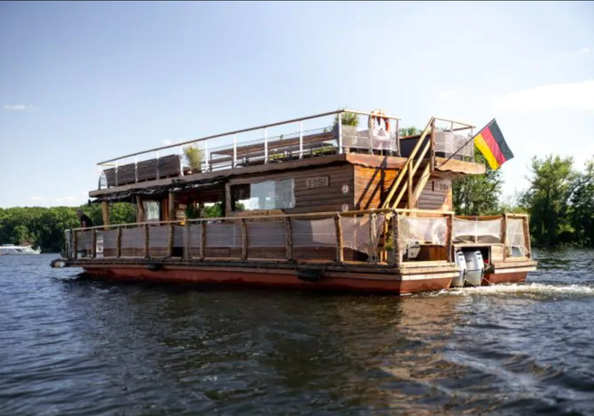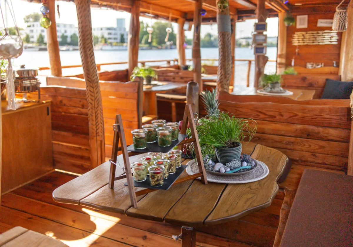 Dann ist das Hauptstadtfloß I genau das Richtige für dich. Mit Platz für bis zu 35 Personen und gemütlichen, überdachten Sitzplätzen ist dieses Boot perfekt für gesellige Runden, Team-Events, Geburtstage oder entspannte Sommerabende mit Freunden. Das Floß punktet mit maritim-rustikalem Charme und einer offenen Bauweise, die Kommunikation und Bewegung an Bord ganz natürlich fördert. Hier sitzt niemand abseits – das gesamte Unterdeck ist umlaufend begehbar. Für das gewisse Etwas sorgen liebevolle Details wie Fischernetze, Pflanzen und stimmige Dekorationen, die echtes Urlaubsfeeling mitten in Berlin aufkommen lassen.