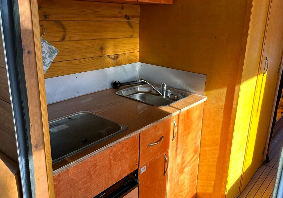 Im "Wohnzimmer" mit offener Küche befindet sich eine Ausziehcouch 0,90m x 2,00m, welche sich zur Schlaffläche (1,40 x 2,00m) ausbauen lässt. Im Schlafzimmer befindet sich ein Doppelstockbett 0,80 x 1,80m (2 Betten) und ein französischen Bett 1,40 x 2,00m mit jeweils 10cm starken abwischbaren Matratzen. Darüber hinaus gibt es noch ein Waschraum mit Waschbecken und WC.