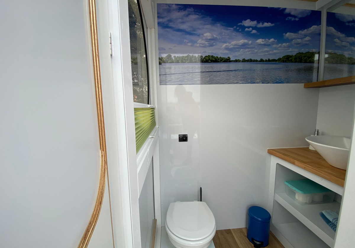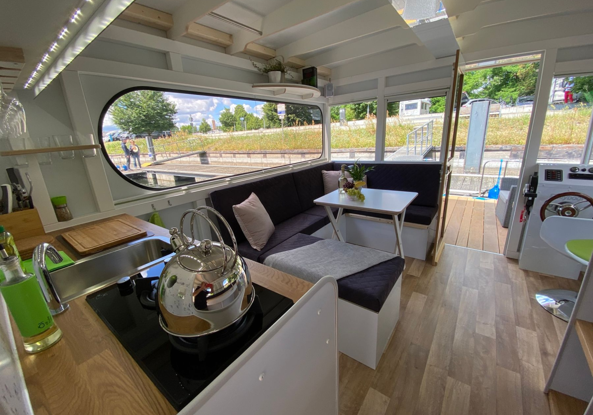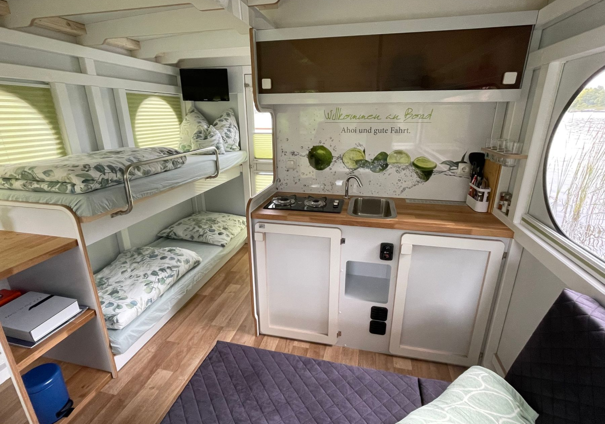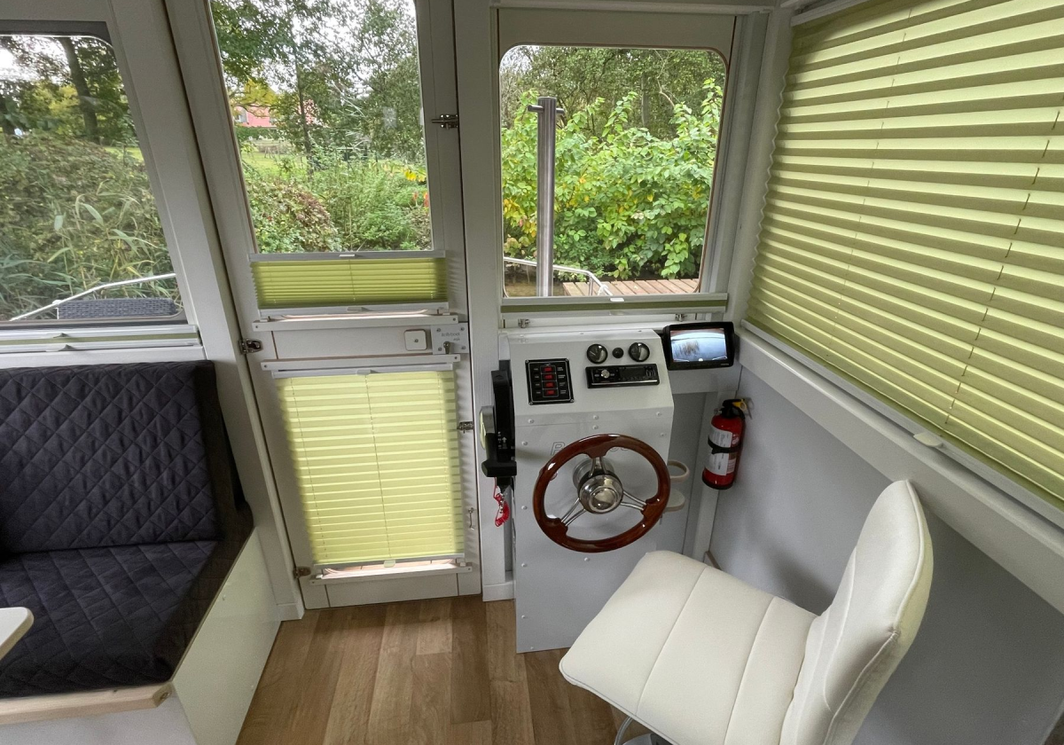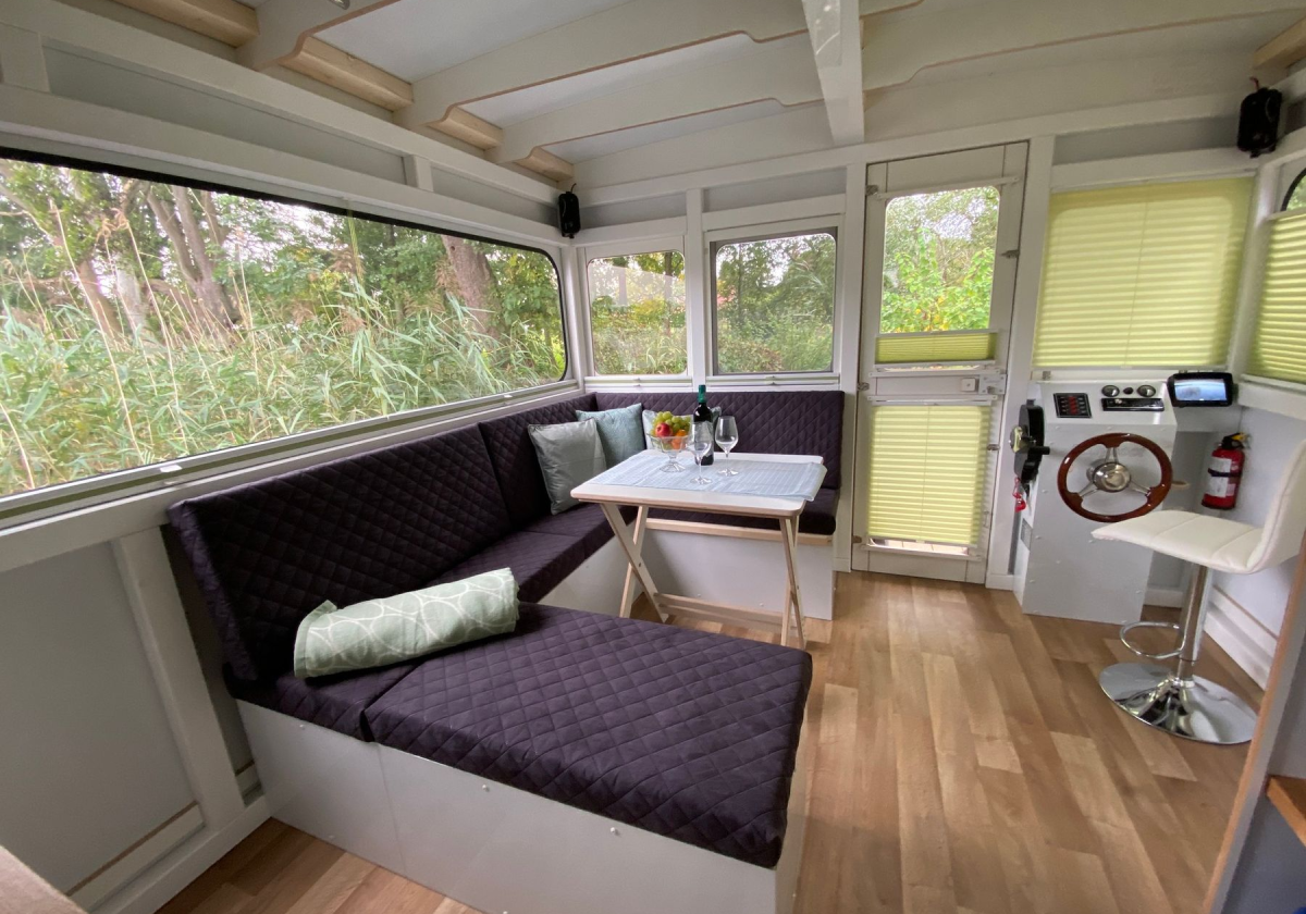 Das Hausboot verfügt über 2+2 Schlafplätze mit genügend Stauraum, eine Küchenzeile mit Kühlschrank, Gasherd und kleinem Spülbecken, einen Innensteuerstand, ein kleines Bad mit elektrischem WC und Designwaschbecken sowie Außendusche. Zusätzliche Stromerzeugung erfolgt über 2 Solarpaneele auf dem Dach. Das Happy-Hausboot ist Allergiker geeignet, da Haustiere nicht gestattet sind.