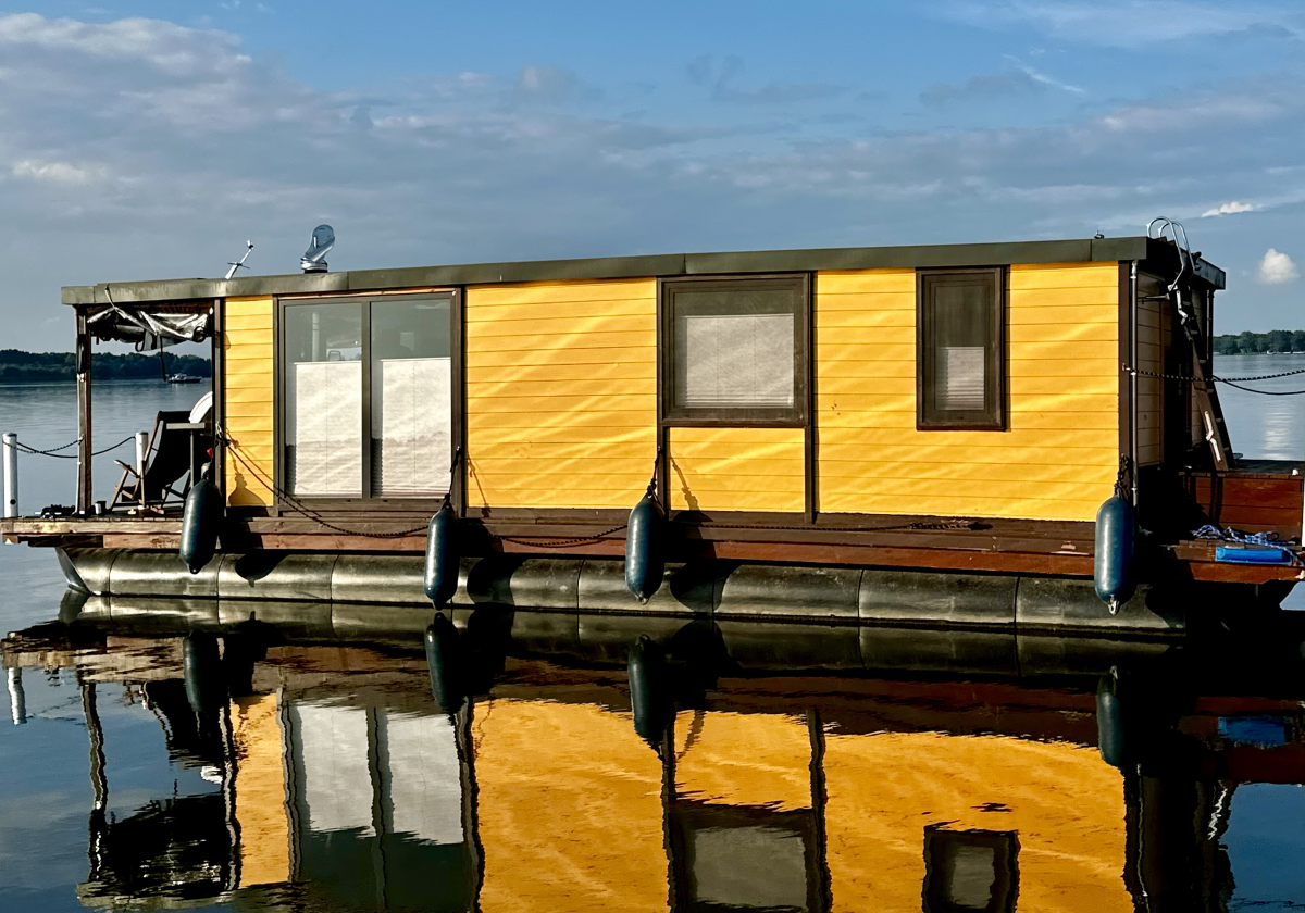 Das Hausboot Frieda liegt im Hafen bei Heidesee, ist für bis zu 12 Personen zugelassen.