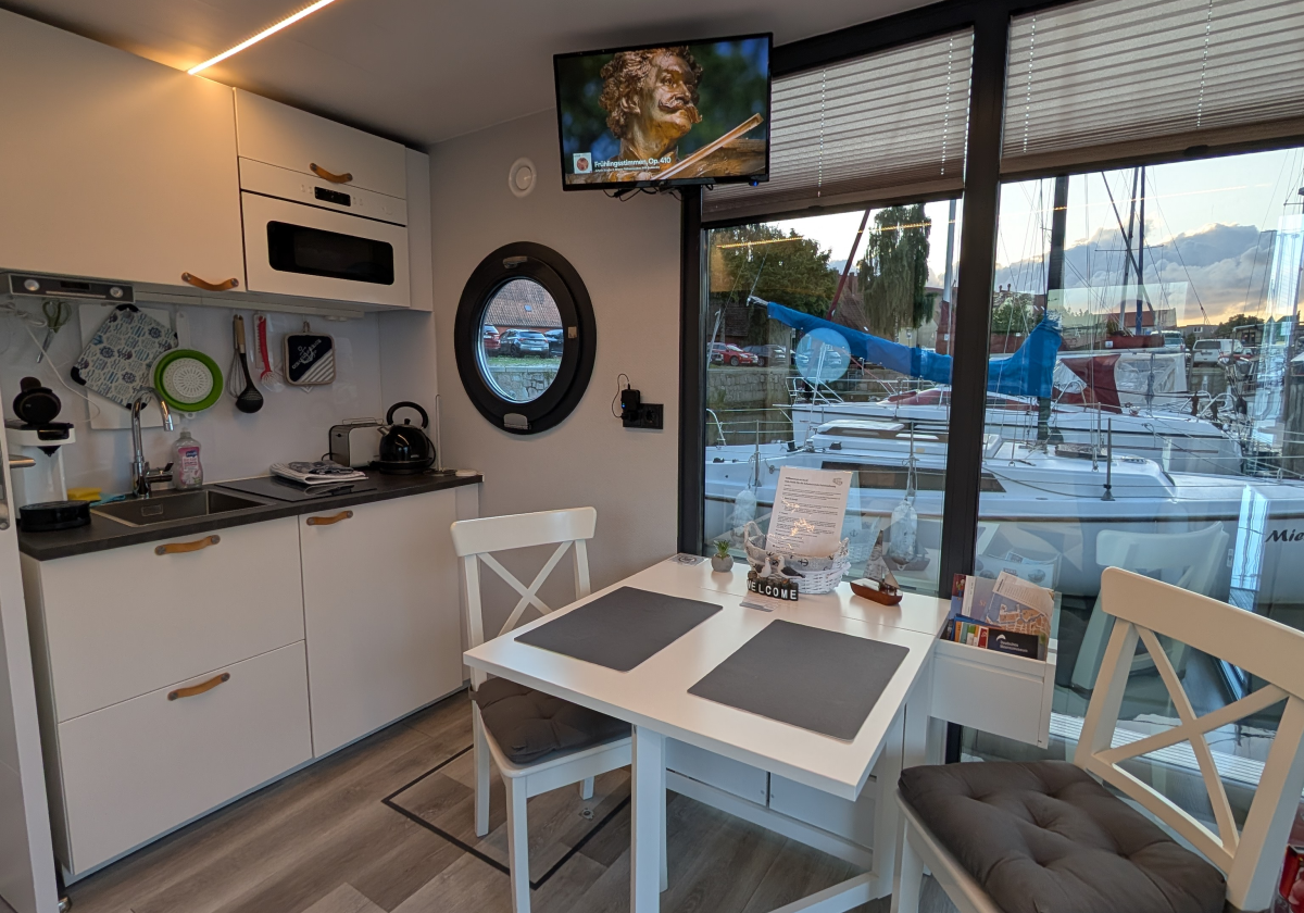 Unser Hausboot Tommi liegt im Flotthafen von Stralsund. Angeln ist erlaubt, Haustiere nicht. Das Hausboot hat 1 Schlafzimmer mit Doppelbett, 1 Badezimmer mit Dusche, Wohnzimmer mit Schlafsofa und Pantry Küche. Es liegt fest im Hafen. Es hat eine Senseo Kaffeemaschine, 1 Toaster und einen Waseerkocher. Ein Kohlegrill kann auf Nachfrage zur Verfügung gestellt werden. Parken bei der Unterkunft ist kostenlos. Bettwäsche, Handtücher, Endreinigung, Wasser und Strom, Parken und Pbernachtungssteuer inklusive. Kaution 300 Euro. Das Hausboot hat keine Dachterrasse, 1 Terrasse vorne am Hausboot. Der Eingang erfolgt übers Wohnzimmer