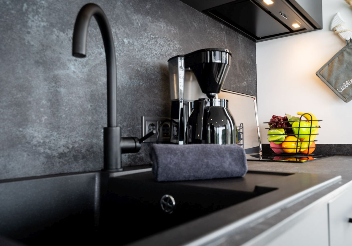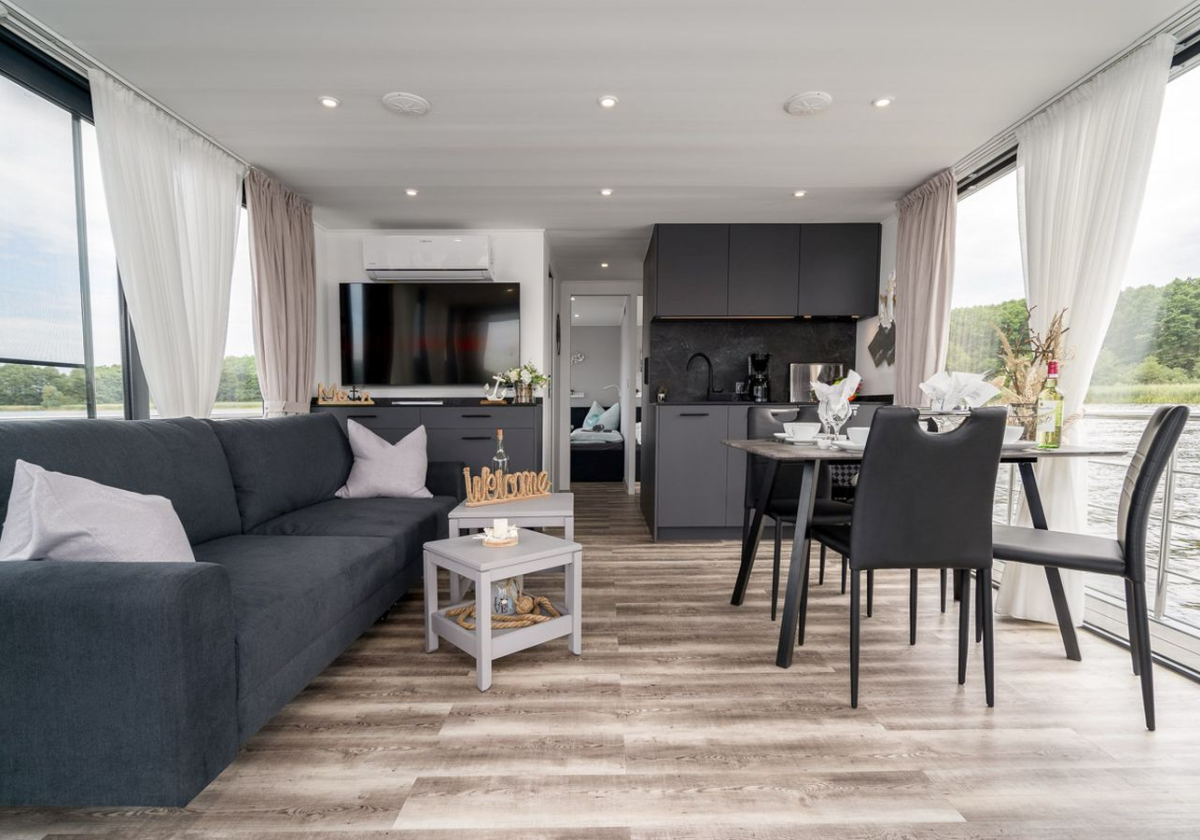 Der Salon mit den bodentiefen Schiebe- /Panoramafenstern und dem ausklappbaren Sofa lädt zum Verweilen ein, hier kann man wunderbar die Seele baumeln lassen. Durch die großzügigen Fensterflächen haben Sie einen herrlichen Ausblick aufs Wasser und die Natur. Bei schlechtem Wetter kann man sich gern den Gas-Kamin anmachen! Dank großem TV und hauseigenem WLAN kommt auch die Unterhaltung nicht zu kurz. Sie finden aber auch Gesellschaftsspiele im Sideboard unter dem Fernseher.