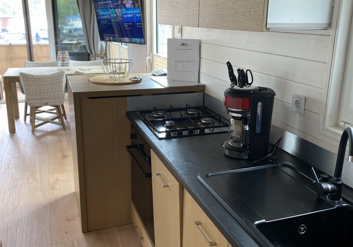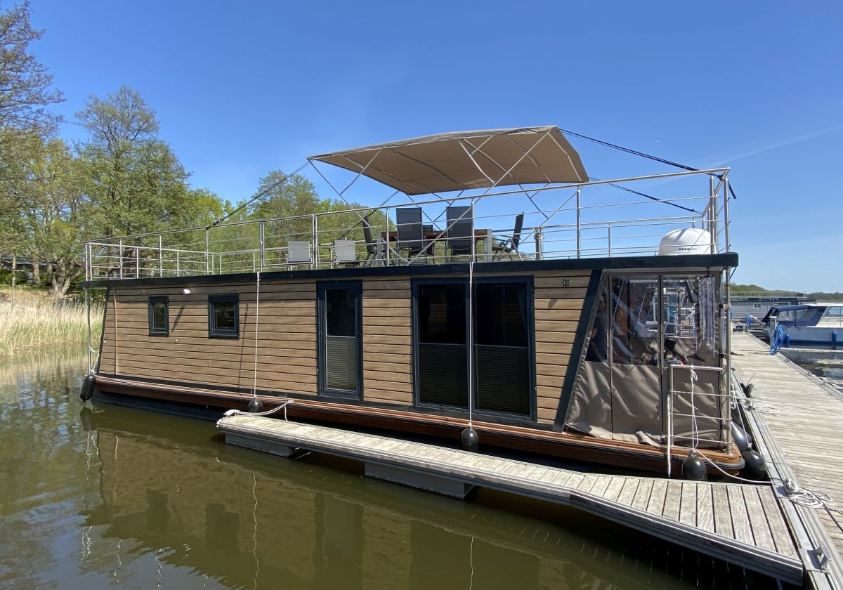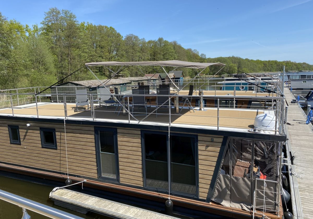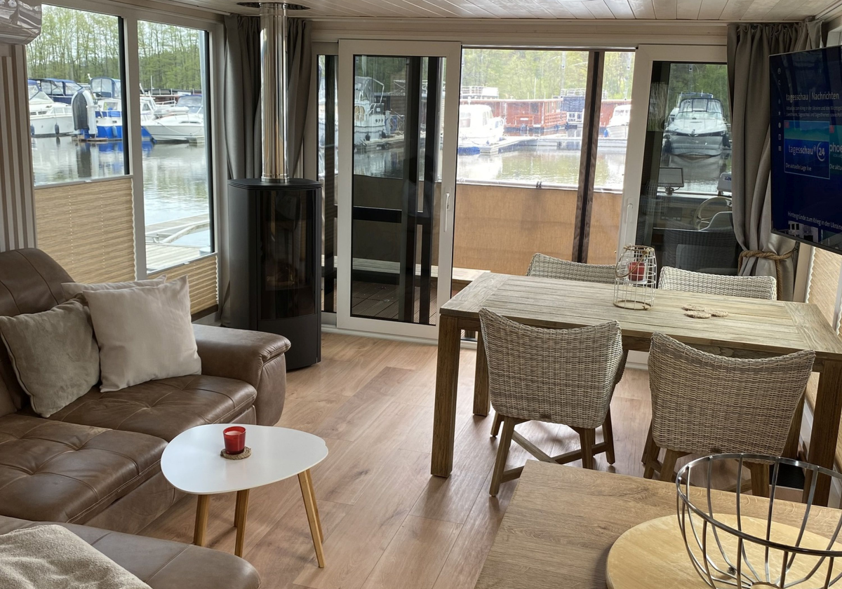 Erleben Sie Natur pur auf der großen möblierten Dachterrasse und gemütliche Abende am Kamin! Bis zu 7 Personen und Ihr Haustier sind an Bord willkommen. Unser schwimmendes Ferienhaus verbindet den Charme eines Hausbootes mit neuesten technischen Anforderungen und Feinheiten im modernen Design. Mit seiner komfortablen Ausstattung entspricht es den Ansprüchen an ein schönes Ferienhaus und bietet Platz für einen außergewöhnlichen maritimen Familienurlaub mit bis zu 7 Personen. Das Hausboot ist modern eingerichtet und verfügt über 48 Quadratmeter Wohnfläche. Mit der leistungsstarken Heizung sowie einer Klimaanlage kann das Boot ganzjährig genutzt werden und bietet auch an kühleren Tagen eine gemütliche Atmosphäre. Viel schöner ist es jedoch, Sonne, Wind und Wasser auf der 50 Quadratmeter großen Terrasse des Oberdecks zu genießen. Grillfreunde können sich beim Hafenmeister einen für das Hausboot geeigneten Grill ausleihen. Sie verfügen über ein vollwertiges separates und abschließbares Badezimmer mit Waschtisch, Dusche sowie ein WC, über eine vollausgestattete Küchenzeile und alles andere, was Sie für einen schönen Tag und bei Nacht auf dem Wasser benötigen. Die beiden abgeschlossenen Innenräume und zwei Terrassen bieten besonders bei Nutzung mit mehreren Personen an Bord ausreichend Rückzugsmöglichkeiten, um in Ruhe Kraft zu tanken und die Sonne und das Wasser zu genießen. Das Hausboot Leon verfügt über einen kraftvollen 40 PS starken Mercury Schub- und Arbeitsmotor. Der Motor läuft sehr leise und effizient – das Manövrieren und Aufstoppen (Anhalten) sowie die Schleusen- und Anlegemanöver werden so zum Kinderspiel. Sie werden das Gefühl haben, mit Ihrer eigenen Yacht unterwegs zu sein – nur deutlich komfortabler. Genießen Sie einen unvergesslichen Traumurlaub! (Bilder bis zur Lieferung beispielhaft)