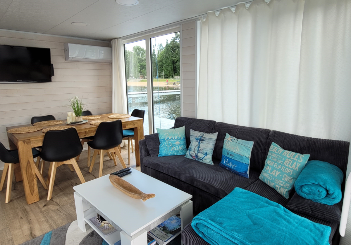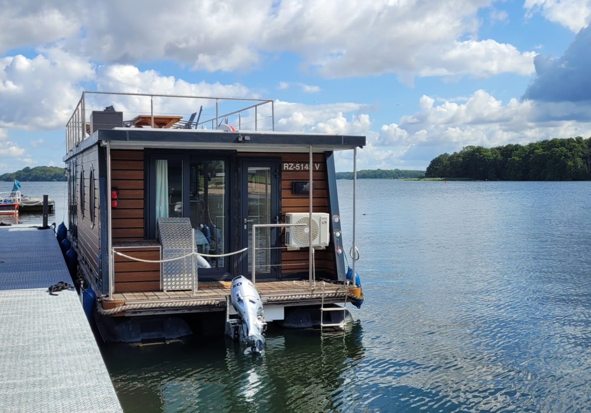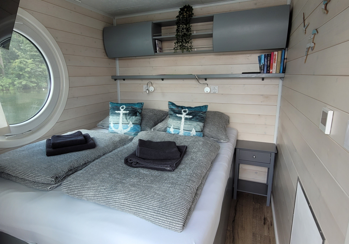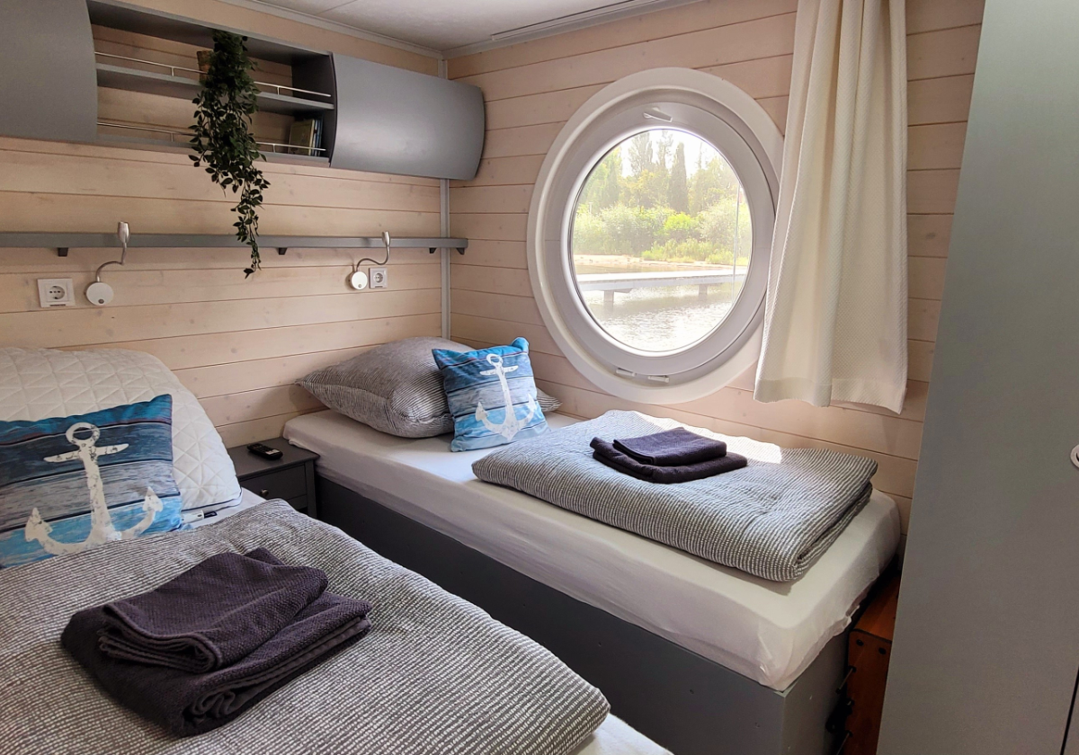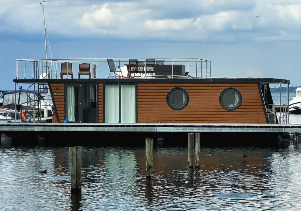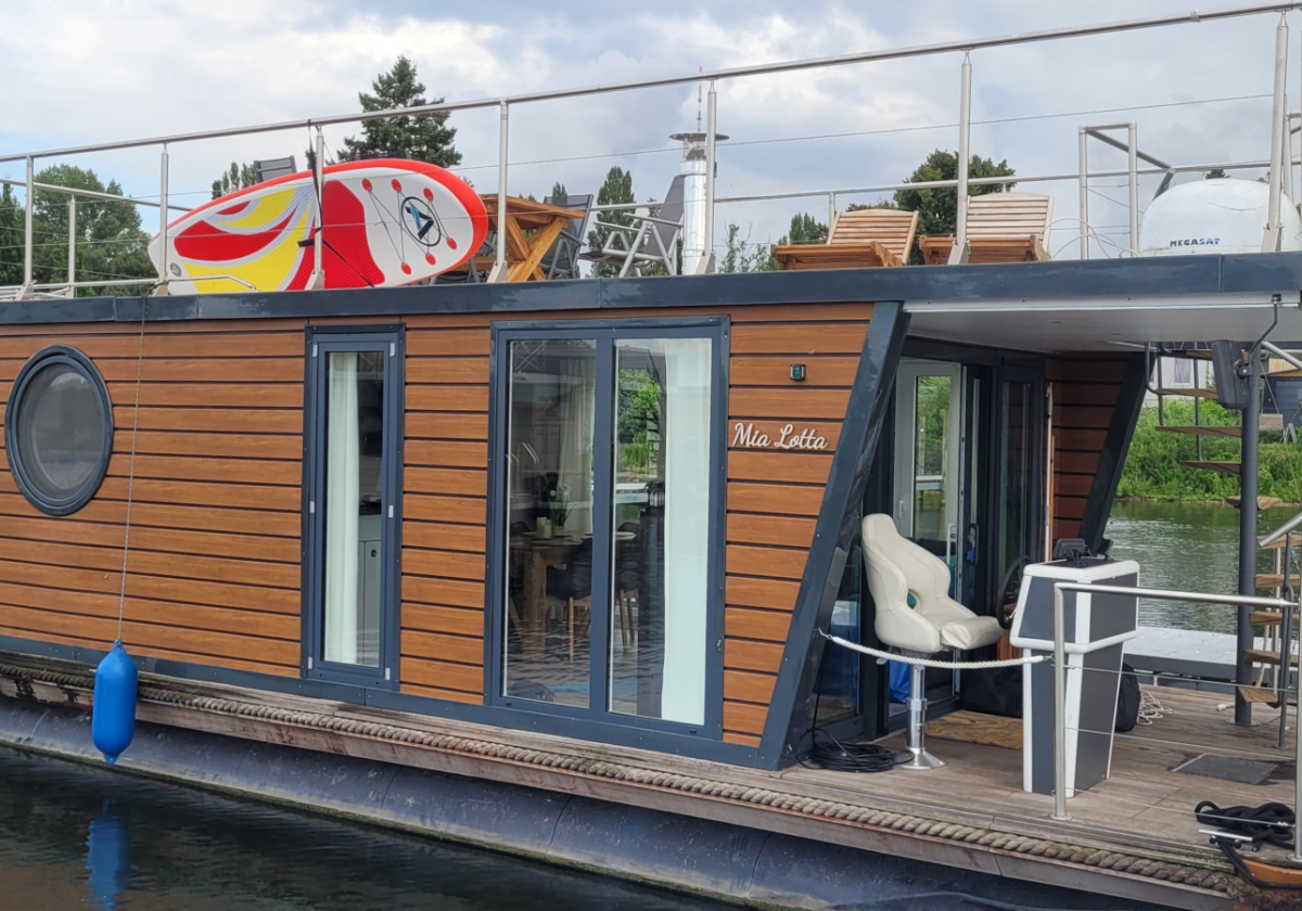 Das moderne Design und die komfortable Ausstattung entspricht genau den Ansprüchen an ein schönes schwimmendes Ferienhaus. Die führerscheinfreie MIA LOTTA bietet ausreichend Platz für 4+2 Personen auf 48qm Wohnfläche und ebenso großer Dachterrasse. Sie verfügt über zwei separate Schlafräume, einem Wohnzimmer, offener Küche und einem Badezimmer.