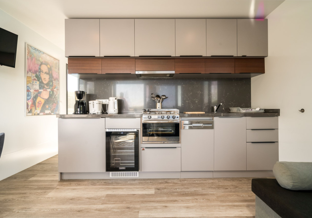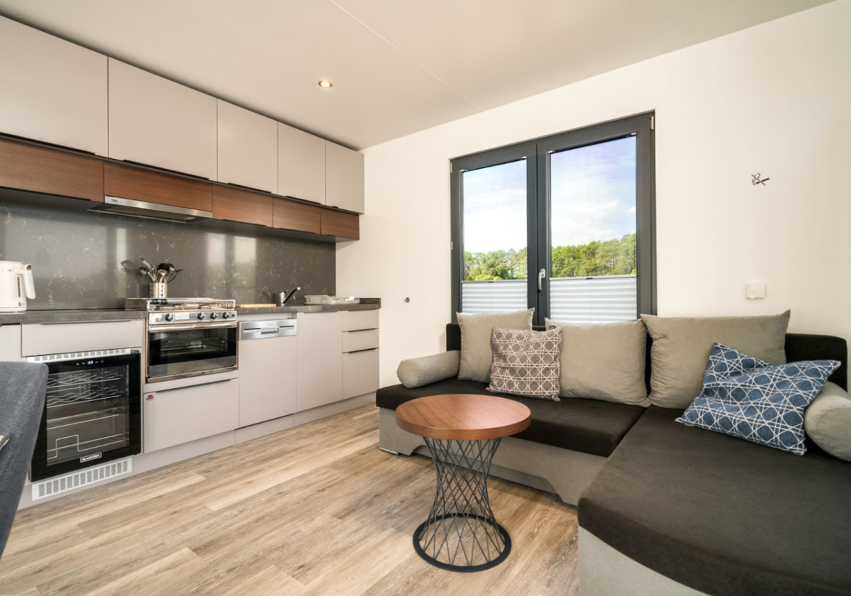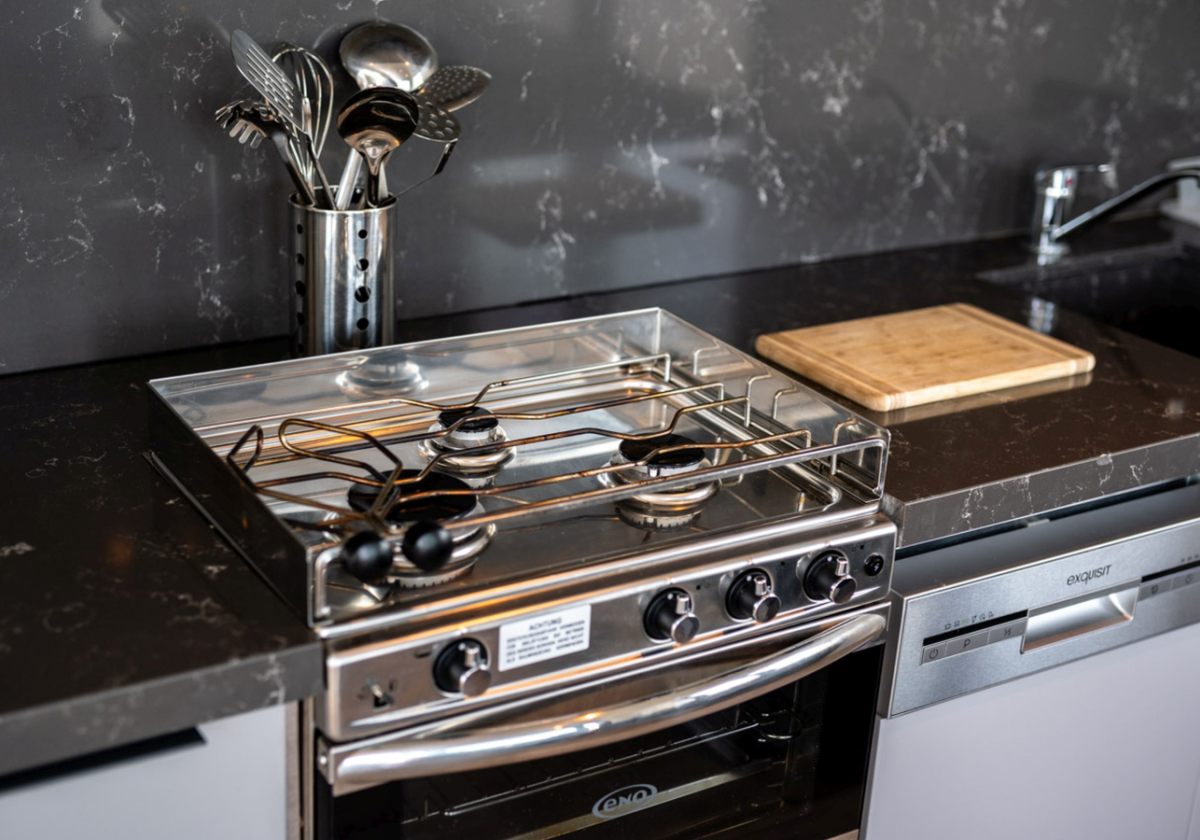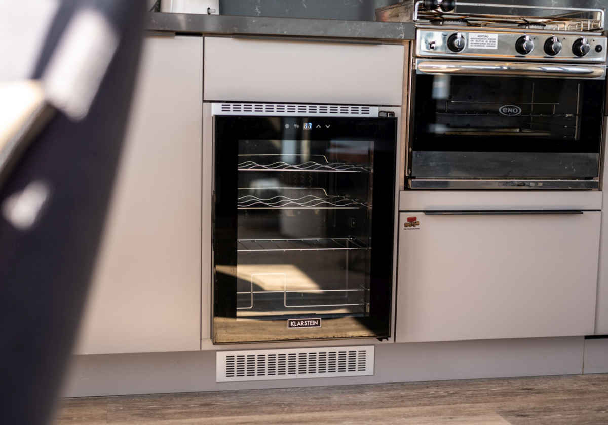 Auch die Küche lässt keine Wünsche offen: Der Gasherd mit Backofen lässt Sie auf Ihrer Reise kochen wie zuhause, der Weinkühlschrank sorgt für perfekt temperierte Tropfen als Menübegleitung.