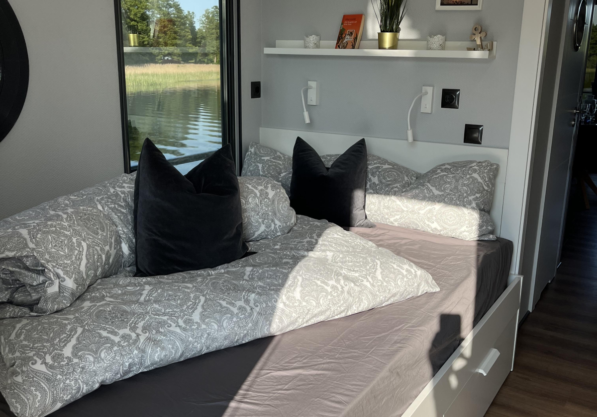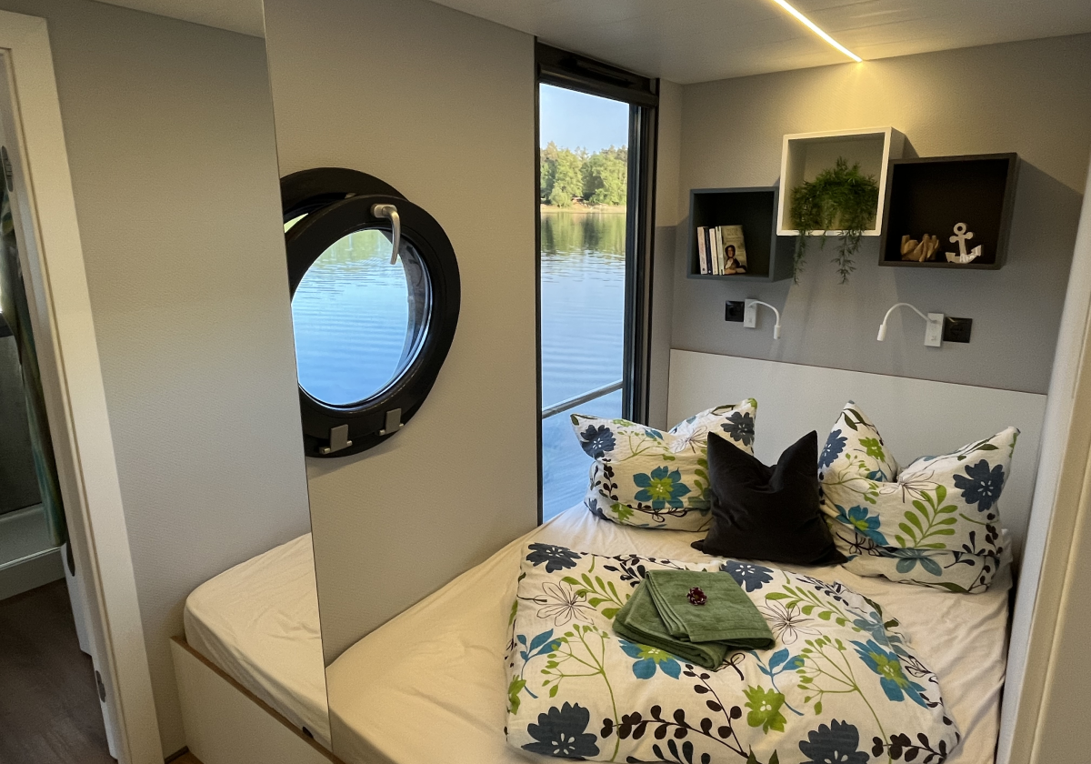 Auf dem Hausboot befinden sich 2 Schlafzimmer mit je einem Doppelbett (140x200cm) inkl. Bettkastenfunktion sowie Kleiderschränke mit Spiegeltüren, welche genügend Stauraum für Ihre Besitztümer bieten. Durch die bodentiefen Fenster am Kopfende der Betten können Sie unbeschwert das Treiben im Hafen oder den Sonnenaufgang am Morgen genießen.