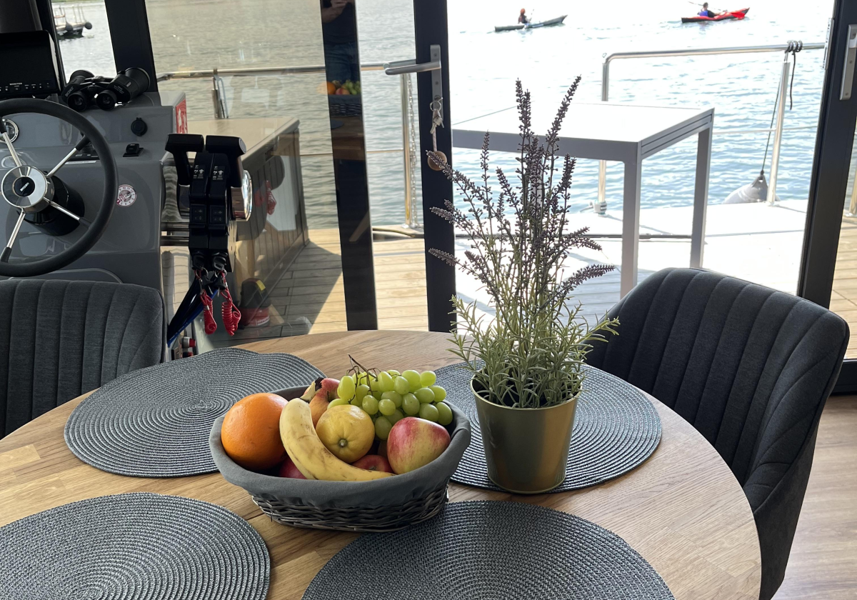 Auf der 9m² großen Bugterrasse mit Tisch und Stühlen können Sie eingehüllt in wärmende Wolldecken den Sonnenuntergang mit einem Getränk Ihrer Wahl beobachten und den Tag ausklingen lassen.