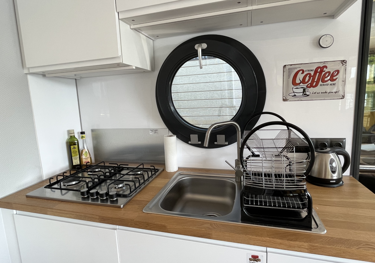 Im offenen Wohnkonzept können Sie entweder vom bequemen Sofa mit Schlaffunktion (Klappbar auf 134x200cm) oder von den komfortablen Drehstühlen am Tisch, den Blick aus den großen Panoramafenstern schweifen lassen. Alternativ gibt es über der Kommode einen Smart-TV mit integriertem DVD-Player sowie WLAN-Zugang, sollten die Bücher einmal ausgelesen sein. Das Wohnzimmer ist außerdem mit einer Fußbodenheizung ausgestattet, sodass es auch in der kalten Jahreszeit keine kalten Füße gibt. In der kompakten Küchenzeile kann dank umfangreicher Ausstattung und dem 4er-Gaskochfeld sehr gut für das leibliche Wohl gesorgt werden. Staumöglichkeiten für den Proviant sind im angrenzenden HWR gegeben.