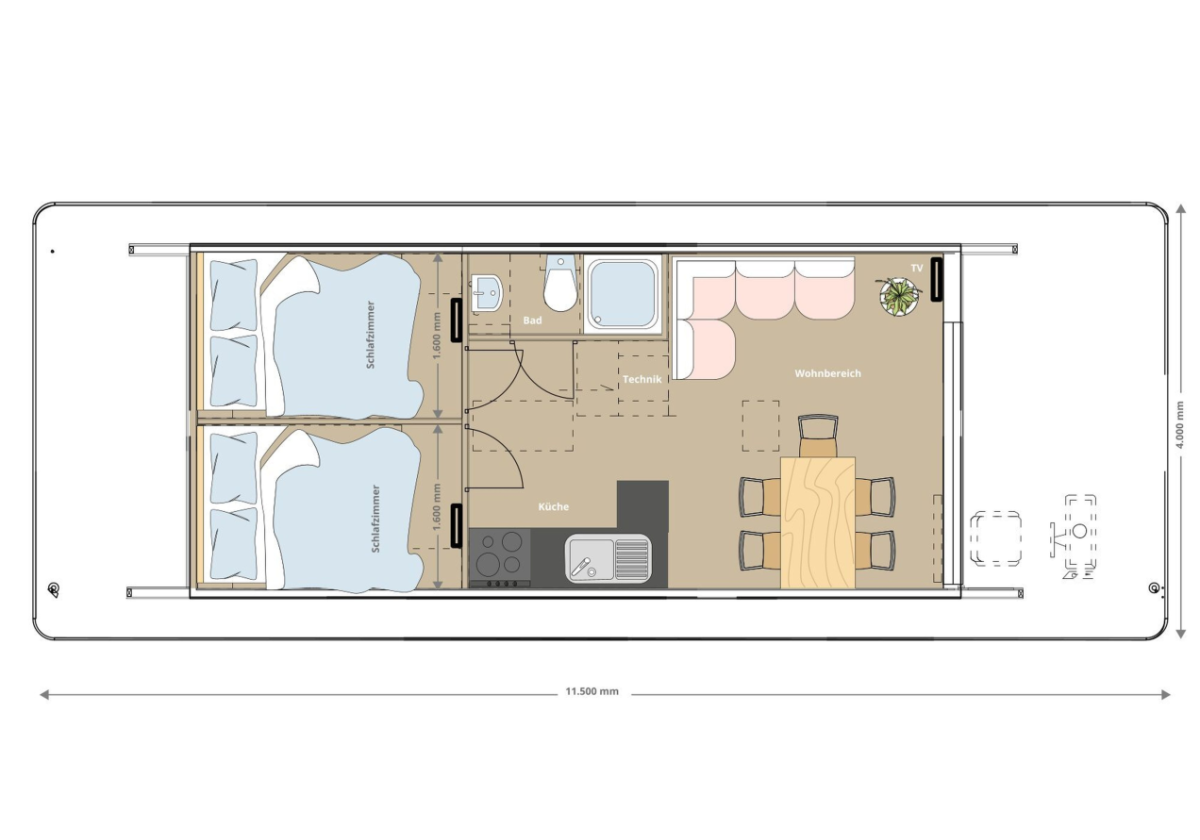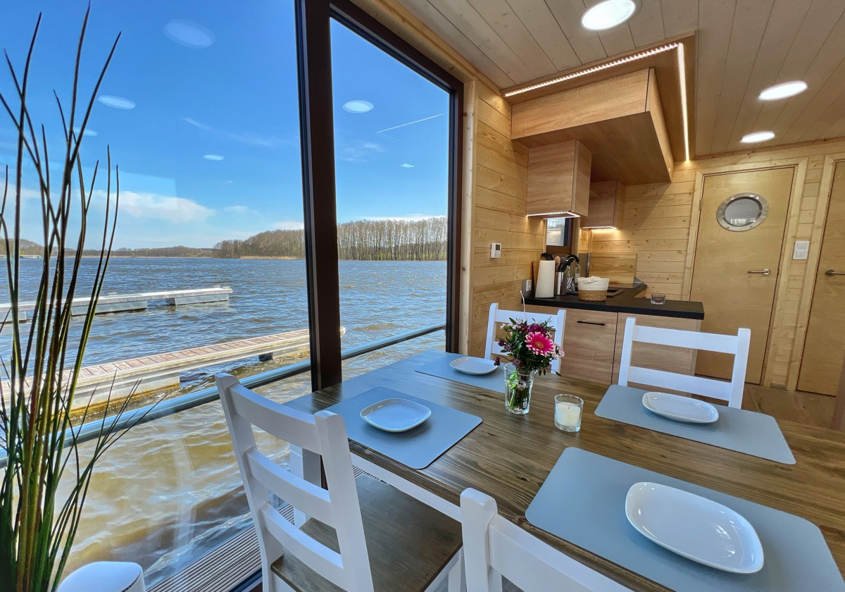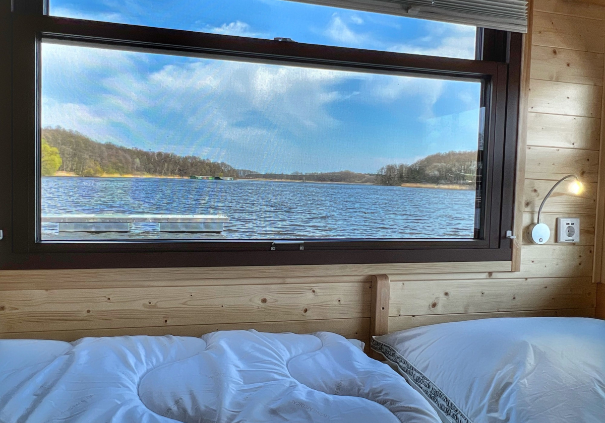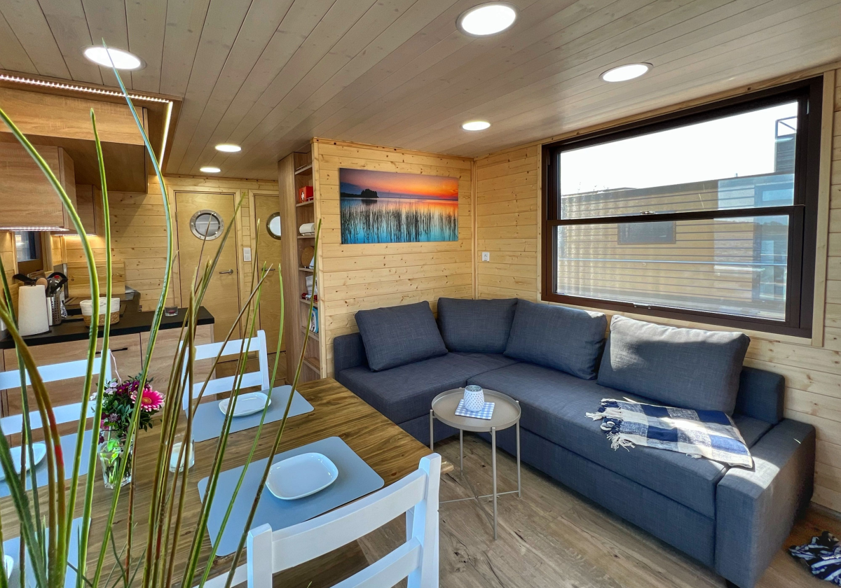 Am Morgen genießen Sie den Ausblick durch die großen Fenster auf die wunderschöne Seenlandschaft. Zudem bietet das bequeme 1,40 m Schlafsofa eine weitere Schlafmöglichkeit für bis zu 2 Personen und/oder ausreichend Platz zum Chillen. Der ausklappbare SMART-TV sorgt dabei für Unterhaltung.