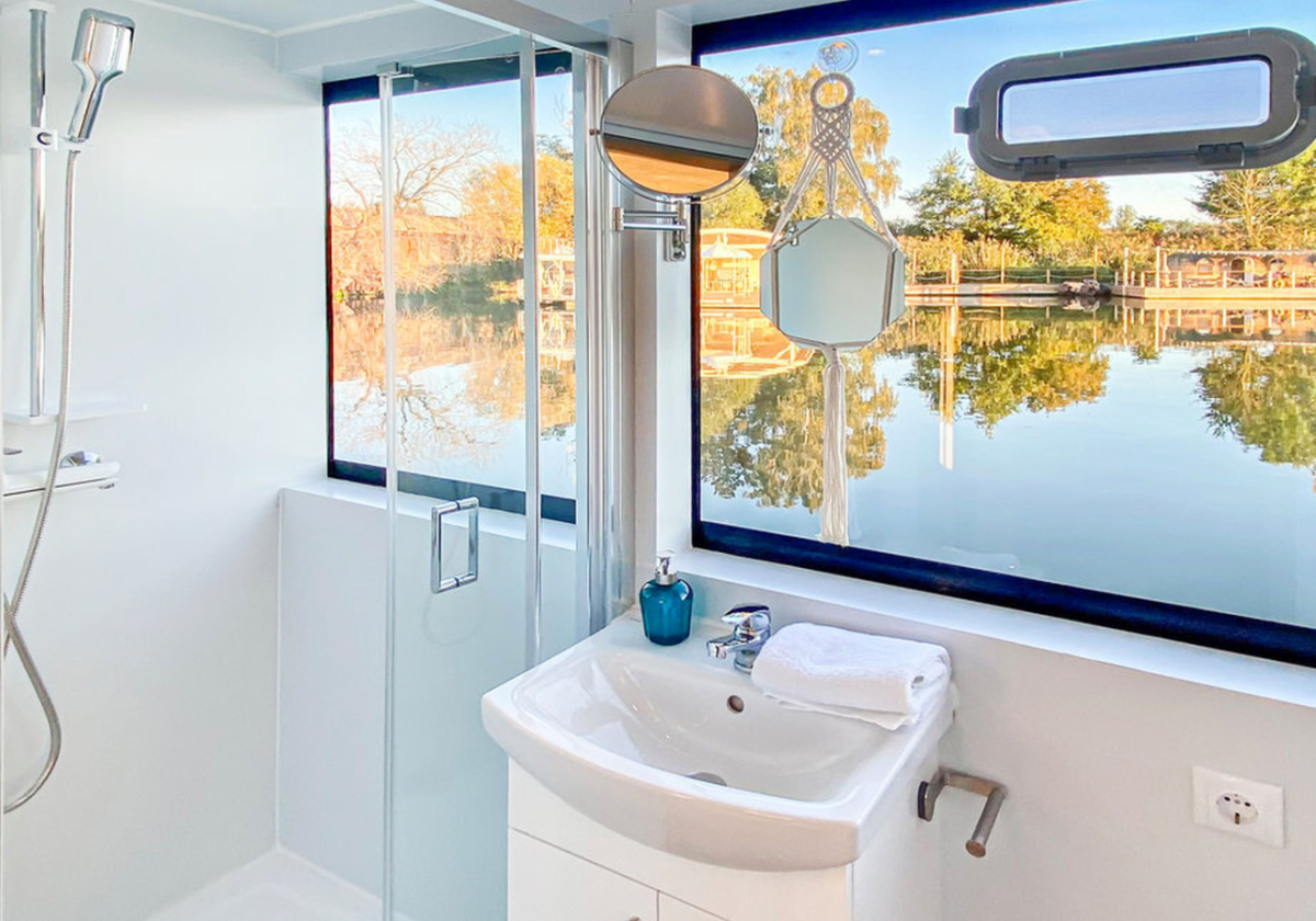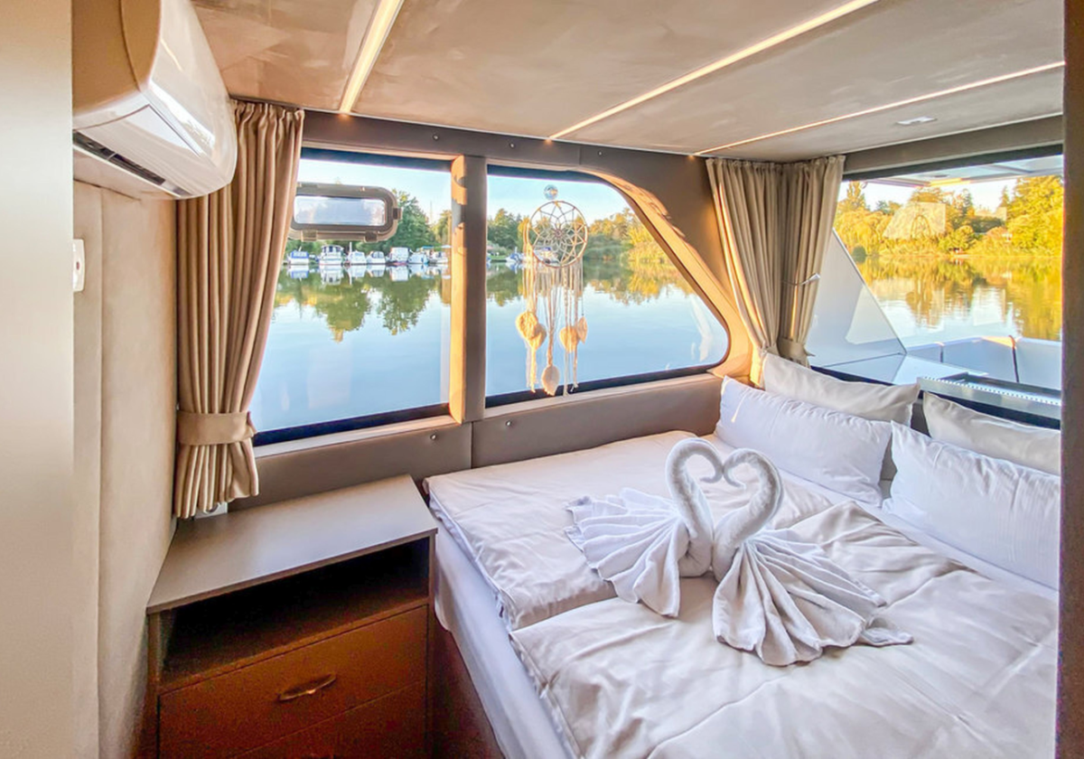 Über die Bug-Terrasse gelangen Sie in den Salon. Dort finden Sie eine Sitzecke inklusive Ausklappcouch (140 x 200 cm) sowie eine gut ausgestattete Küche mit Spülbecken und zwei Kochfeldern. Über den in der Küchenzeile integrierten Fernseher können Sie nach Herzenslust Ihre Streamingdienste nutzen. Im hinteren Bereich des Bootes befinden Sie dann zwei gemütliche Kojen mit Doppelbetten (160 x 200 cm) sowie ein kleines Bad (Dusche, Fußbodenheizung, elektr. Häcksler-Toilette und Waschbecken). Es gibt ausreichend Stauräume in den Schränken, der Küche und unterhalb der Betten. Alle Fenster und Türen sind mit Vorhängen und Plissees ausgestattet.