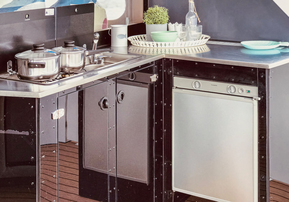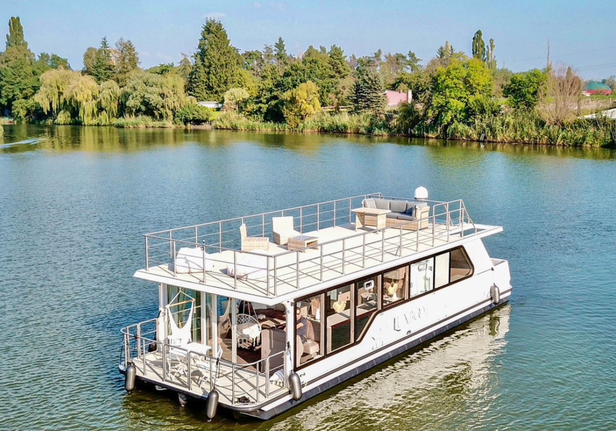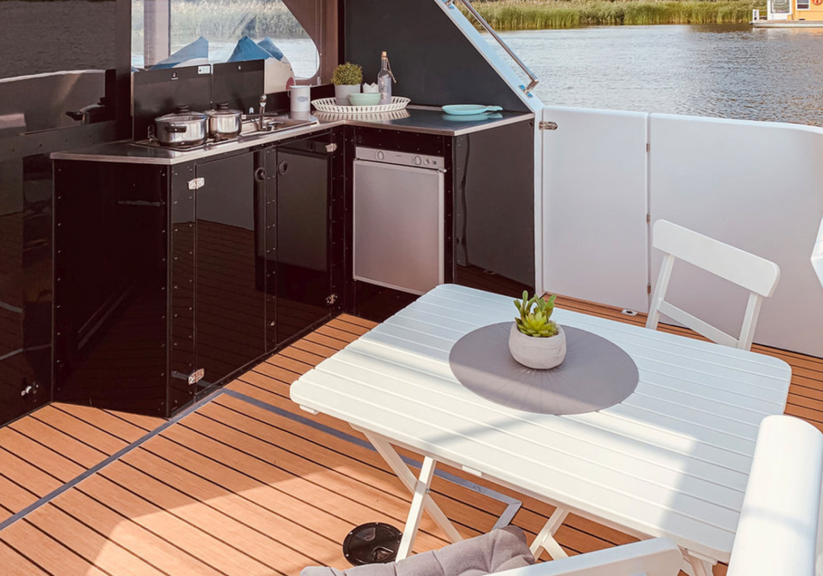 Dank der Rundumverglasung können Sie von überall aus dem Hausboot heraus das Wasser und die Landschaft genießen! Die besonderen Highlights erwarten Sie im Außenbereich: die Heckterrasse ist mit einer Außenküche mit Kühlschrank, Gasgrill und Spüle ausgestattet, so dass Sie hier bei gutem Wetter an der frischen Luft Essen und Getränke zubereiten können. Von der Heckterrasse aus führt eine Außentreppe auf das Dach, wo sich eine herrliche Dachterrasse über dem Wohnbereich erstreckt.