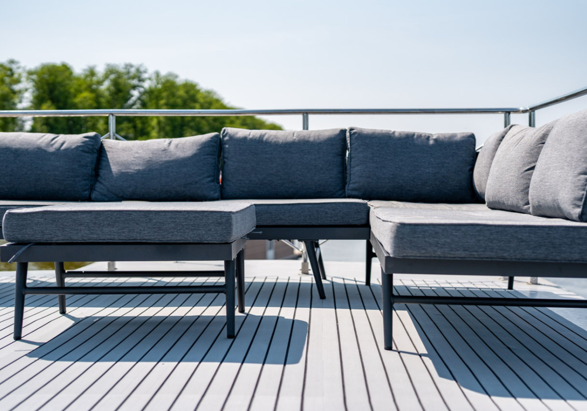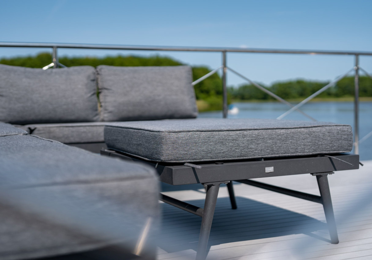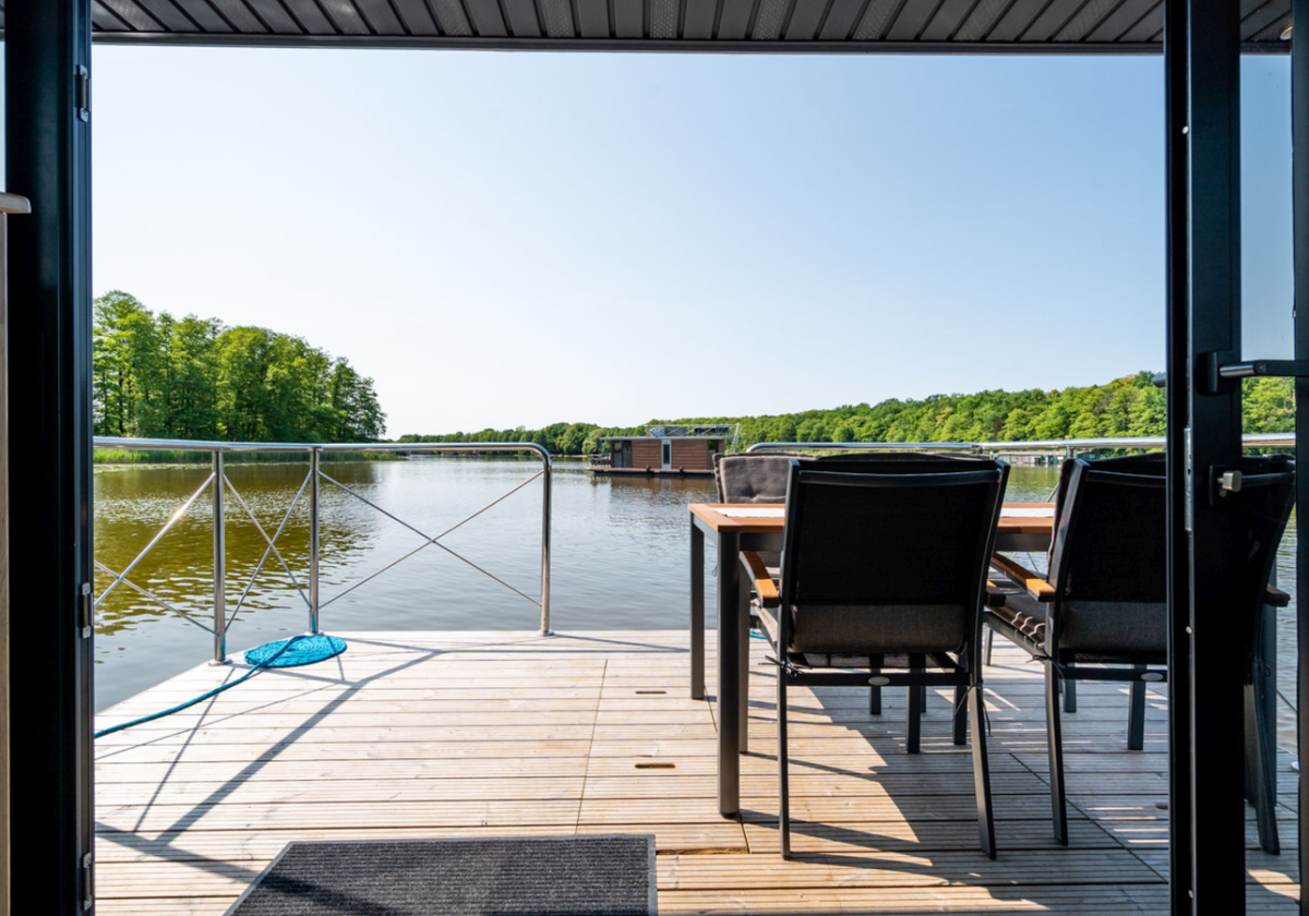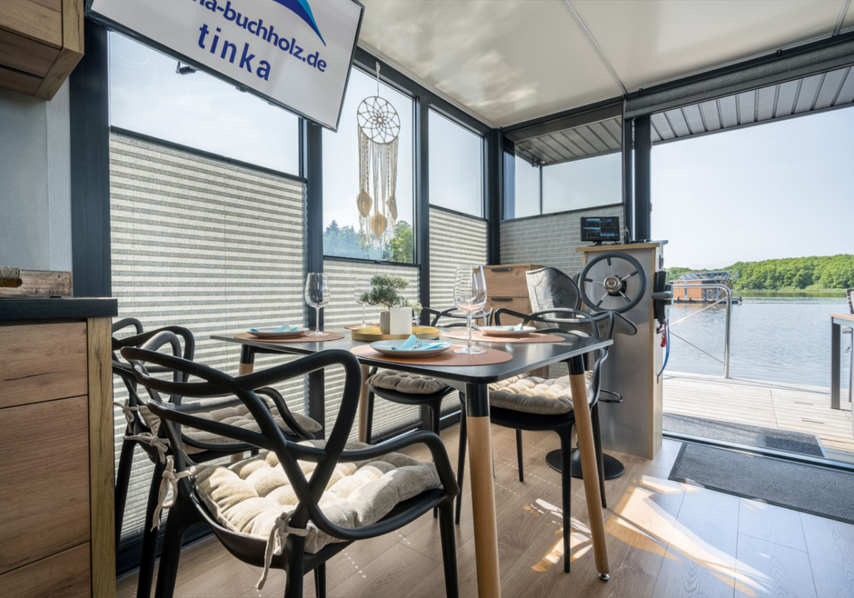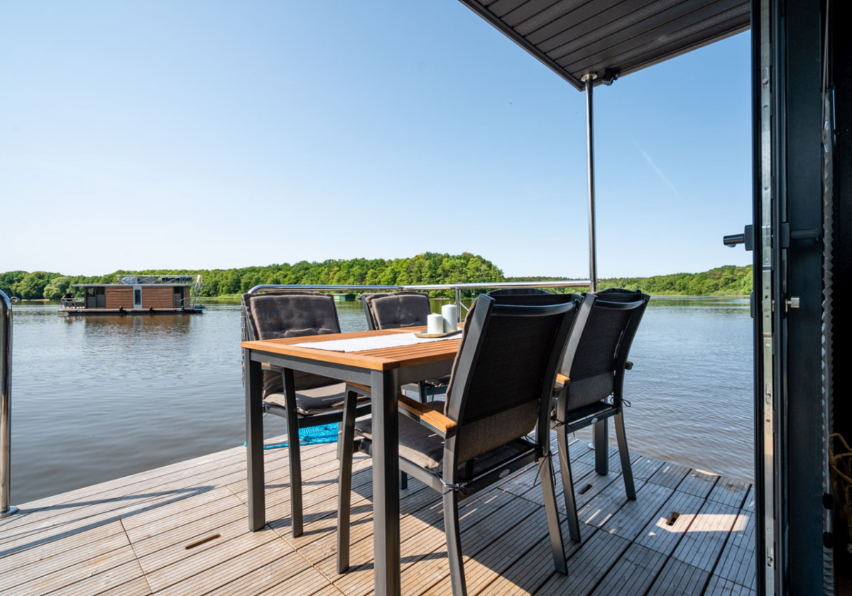 Durch die große Glasschiebetür erreichen Sie die angrenzende Bugterrasse, hier steht ein Tisch mit Stühlen für ein Frühstück, Abendessen oder auch nur für ein Gläschen Wein bereit.