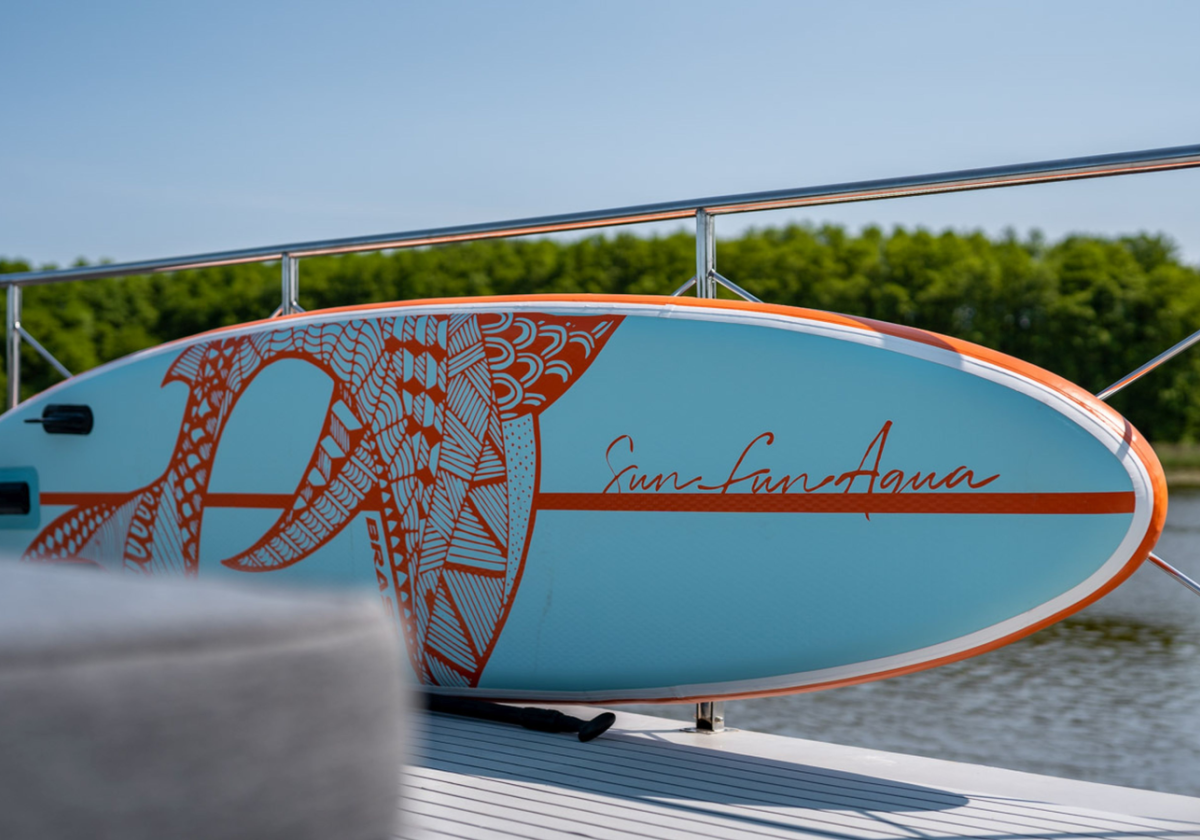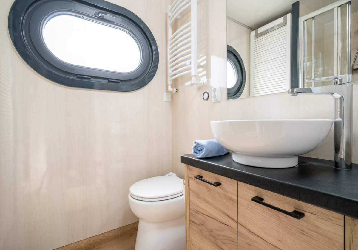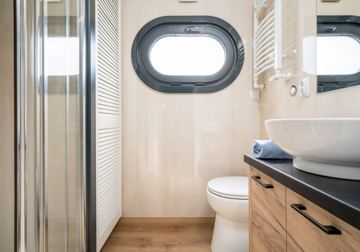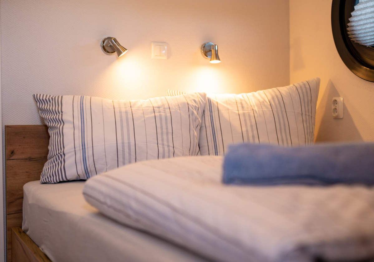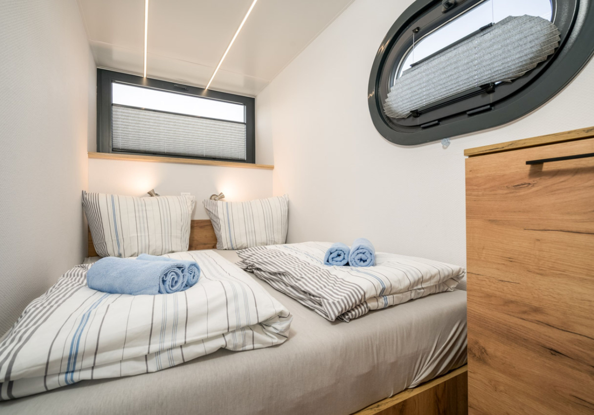 Ausreichend Stauraum finden Sie in den beiden Kleiderschränken und den Schubfächern unter dem Bett. Das Highlight ist aber, dass beide Schlafzimmer einen eigenen Zugang zur Heckterrasse haben, mehr Privatsphäre geht nicht. Da man im Normalfall immer mit dem Heck anlegt, muss niemand durch Ihr Schlafzimmer um in den Salon zu gelangen, oder umgekehrt vom Salon auf die Dachterrasse.