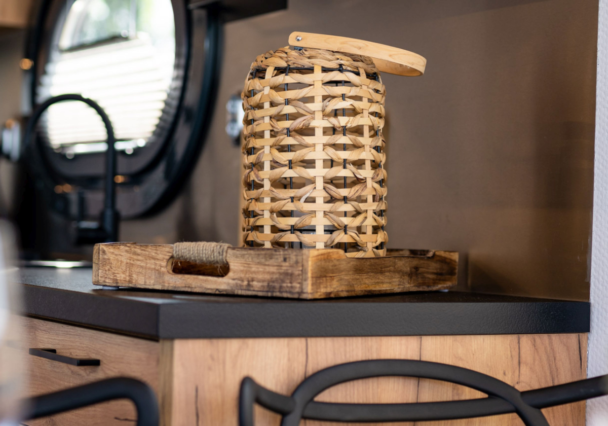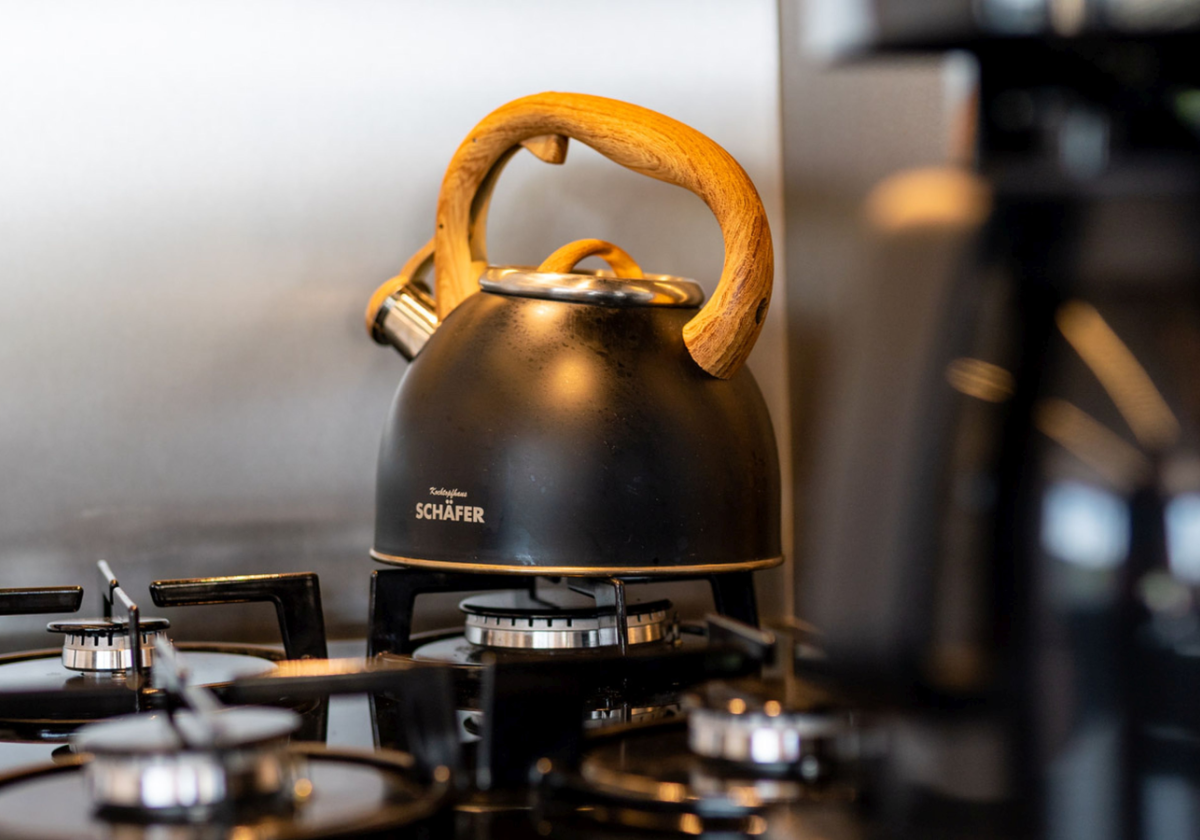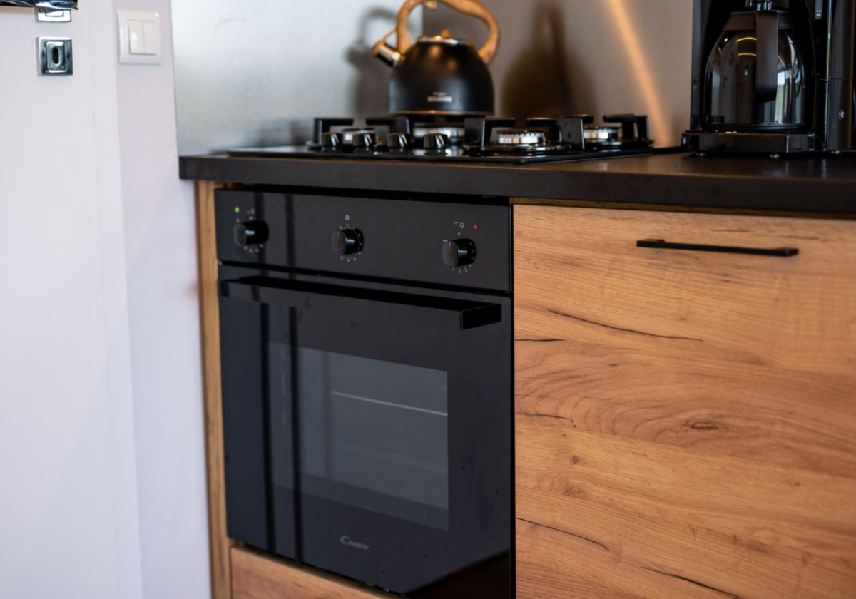 Die angrenzte offene Küchenzeile verfügt nicht nur über viel Stauraum, einer großen Arbeitsfläche, einem Gasherd, Backofen und Kühlschrank, sie ist auch mit allem ausgestattet was Sie benötigen, um sich selbst zu verpflegen.