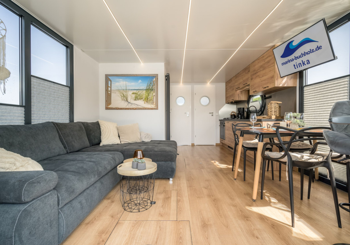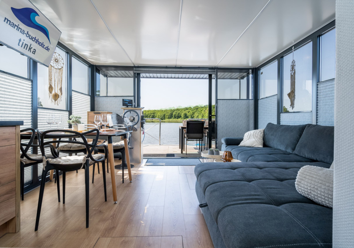 Der Salon mit den bodentiefen Schiebe- Panoramafenstern und der großen Wohnlandschaft lädt zum Verweilen ein, hier kann man wunderbar die Seele baumeln lassen.Durch die großzügigen Fensterflächen haben Sie einen herrlichen Ausblick aufs Wasser und die Natur.