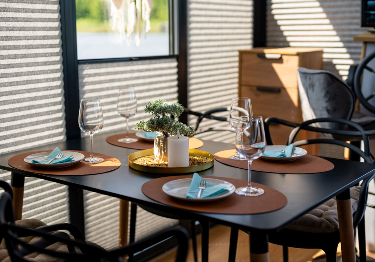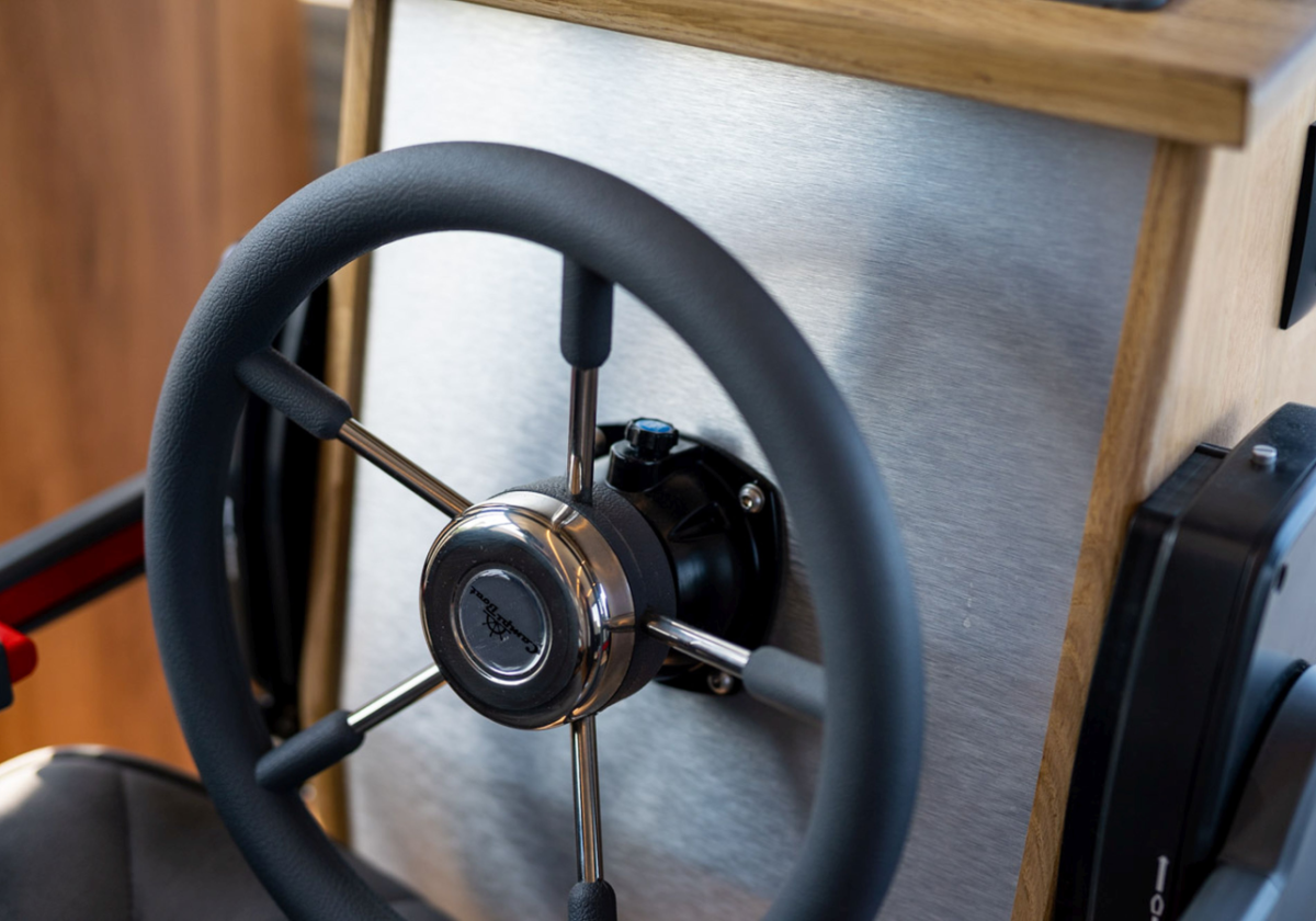 Im Salon befindet sich auch der Esstisch mit 4 Stühlen (erweiterbar auf 6) und der Steuerstand mit „Kapitänsstuhl“, von dem aus das Hausboot über die Seen und durch die Kanäle gesteuert wird.