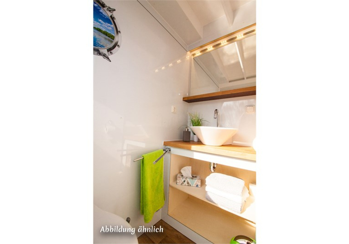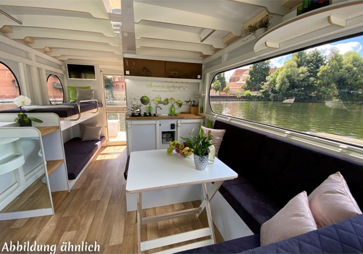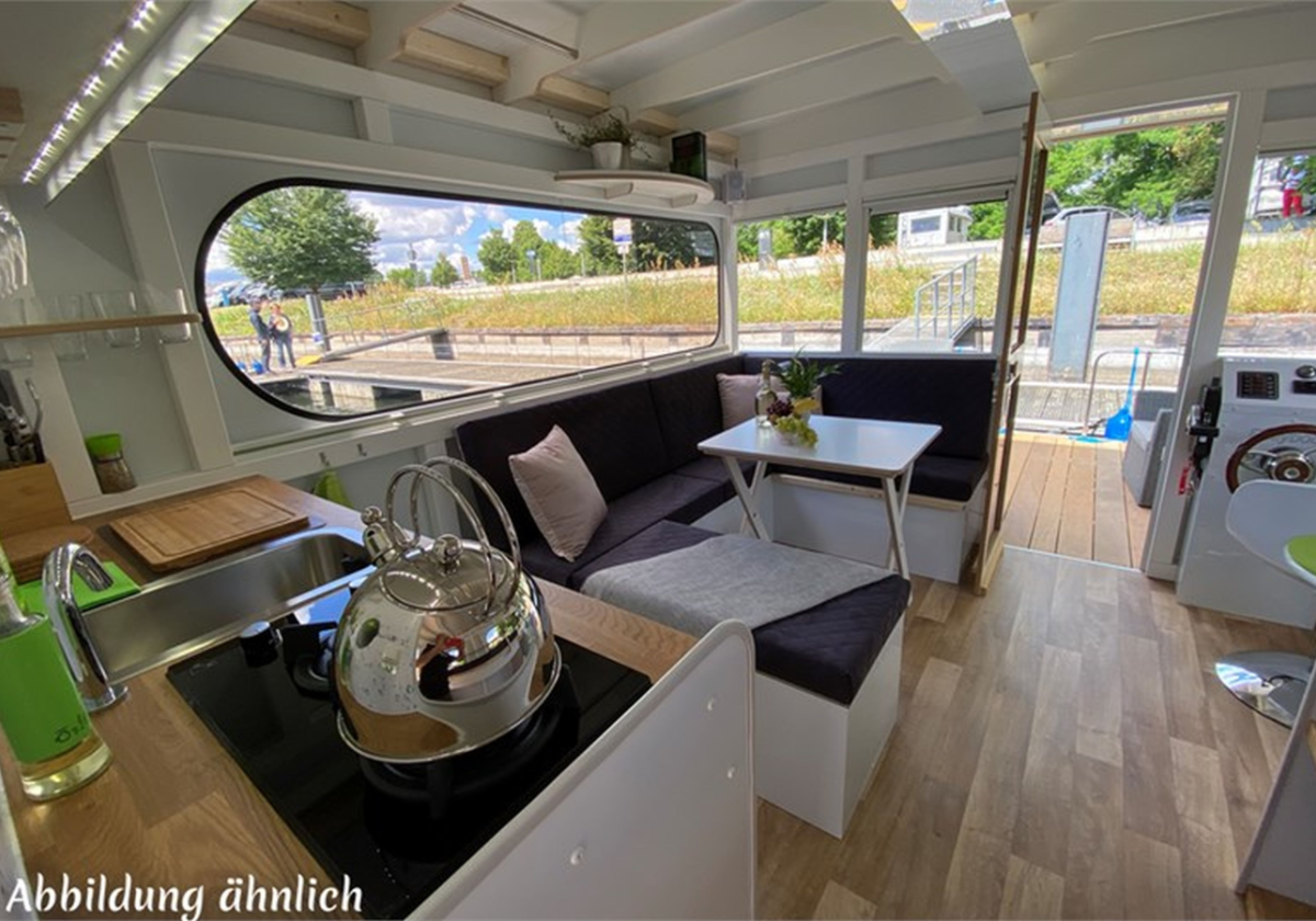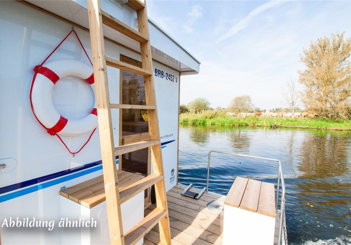 Das Hausboot verfügt über 2+2 Schlafplätze, eine offene Küchenzeile mit Kühlschrank und Gasherd, einen Innensteuerstand, ein elektrisches WC und eine Außendusche.