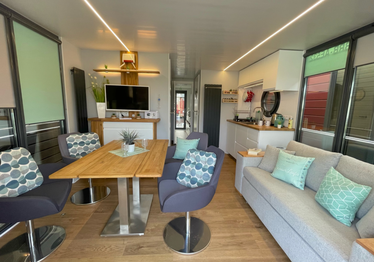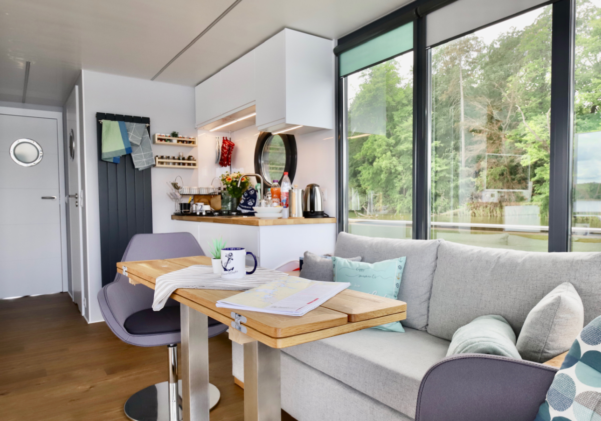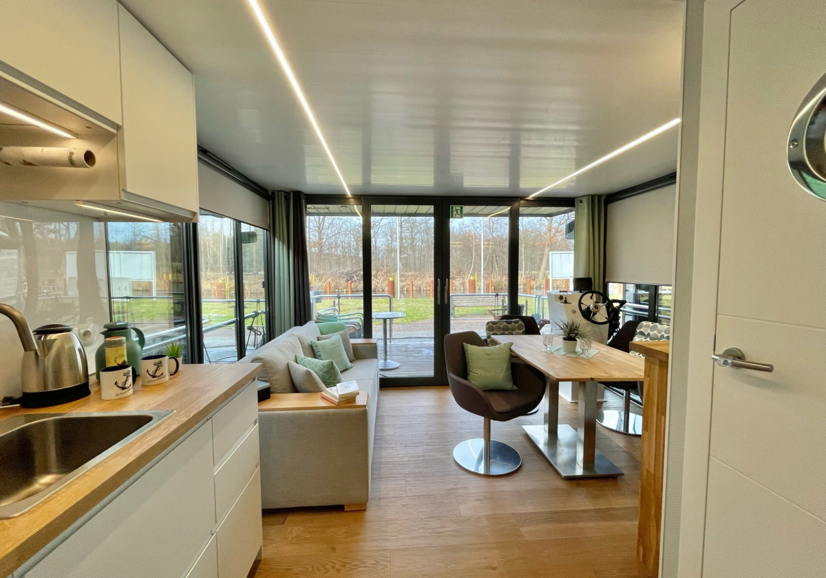 Wohnzimmer mit Steuerstand, Tisch, Stühlen und Sofa mit Schlaffunktion, Schrank und Küchenzeile sowie großen Panoramafenstern.