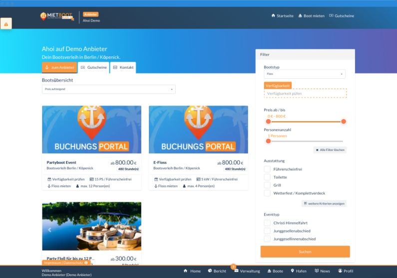 - Top-Listen: Zeigt die meistgebuchten Boote, Optionen, Tarife und Gutscheine