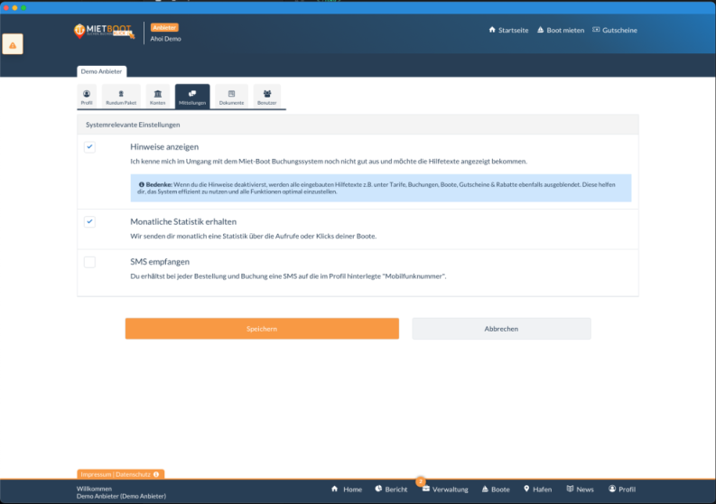 Stelle ein, ob du Hilfetexte angezeigt bekommst, monatliche Statistiken erhalten möchtest und bei Buchungen eine SMS wünschst.