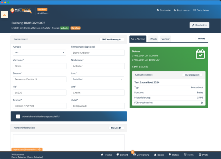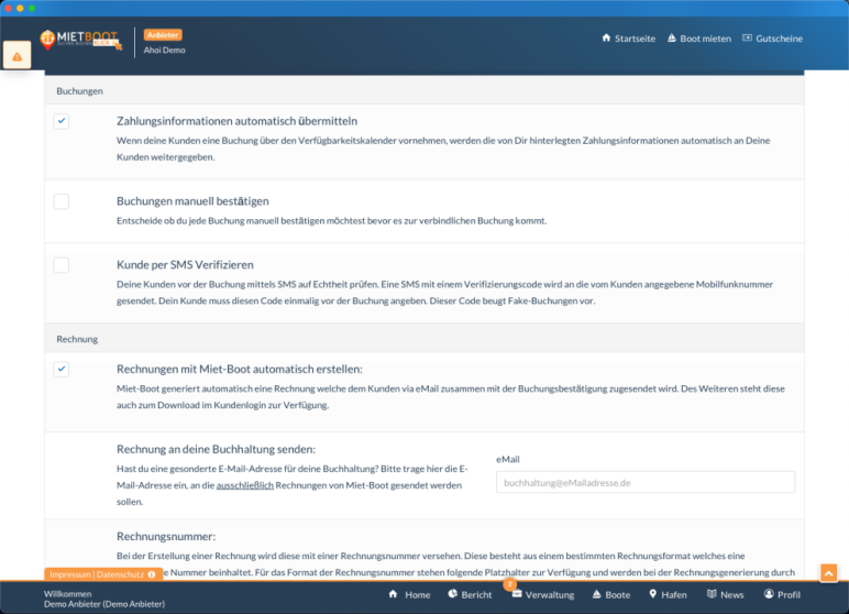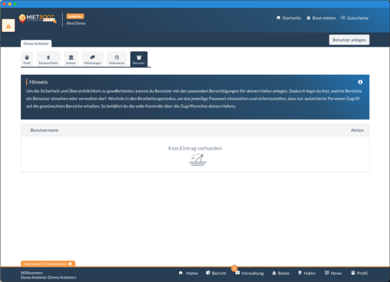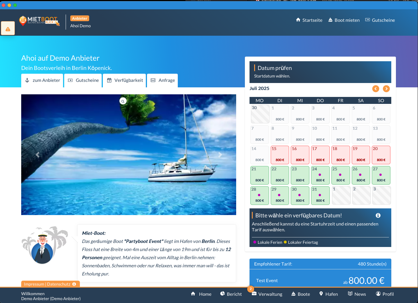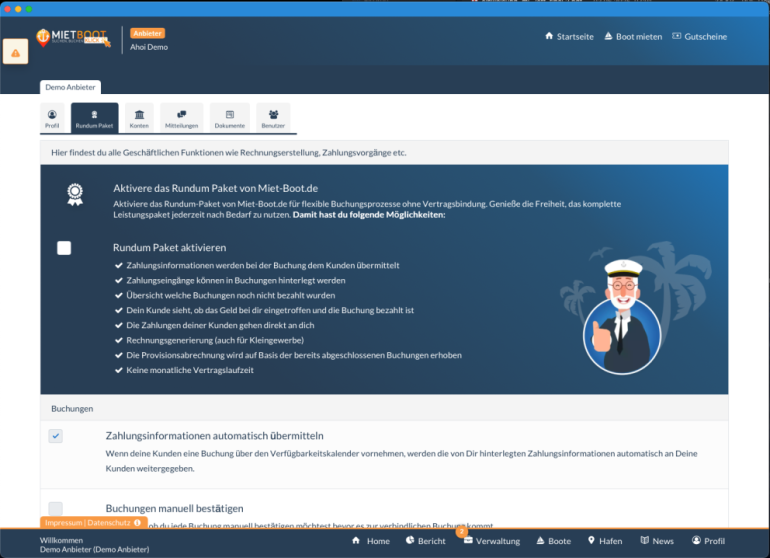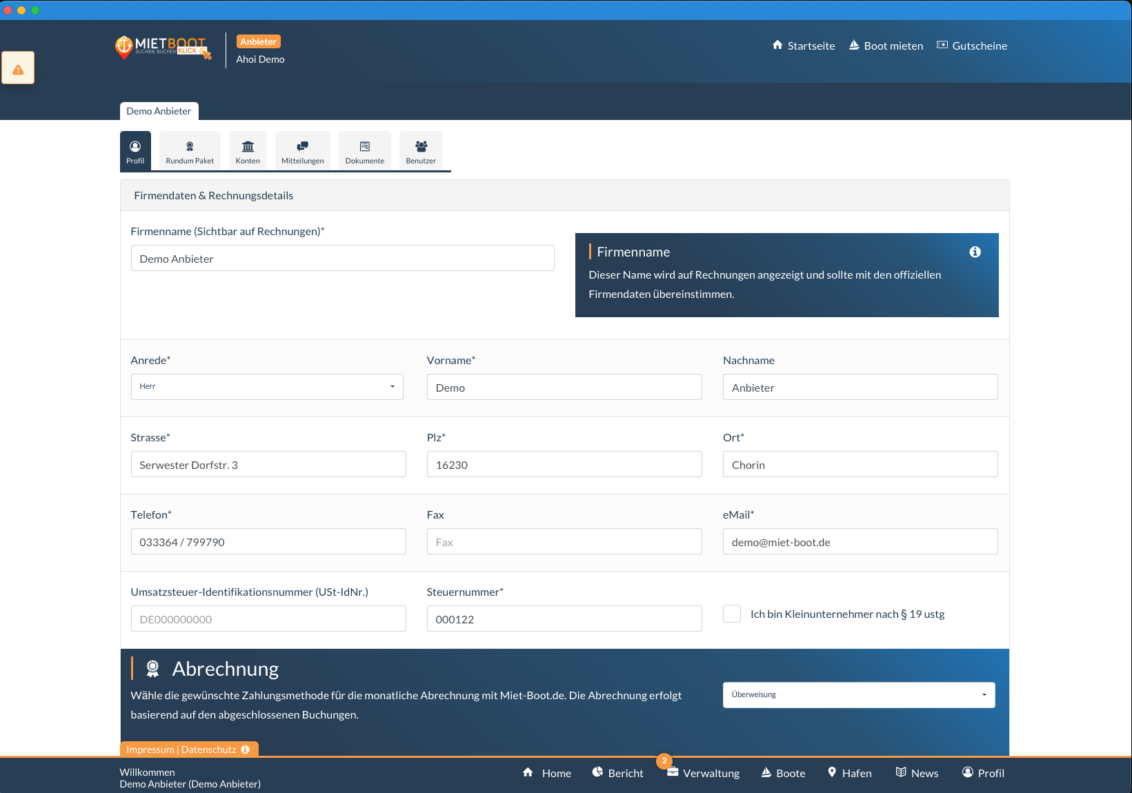 Ein vollständiges Anbieterprofil ist die Grundlage für eine erfolgreiche Präsentation deiner Boote auf Miet-Boot.de. Es sorgt nicht nur für Vertrauen bei deinen Kunden, sondern stellt auch sicher, dass alle buchungsrelevanten Prozesse reibungslos ablaufen – von der Rechnungserstellung bis zur Zahlung.