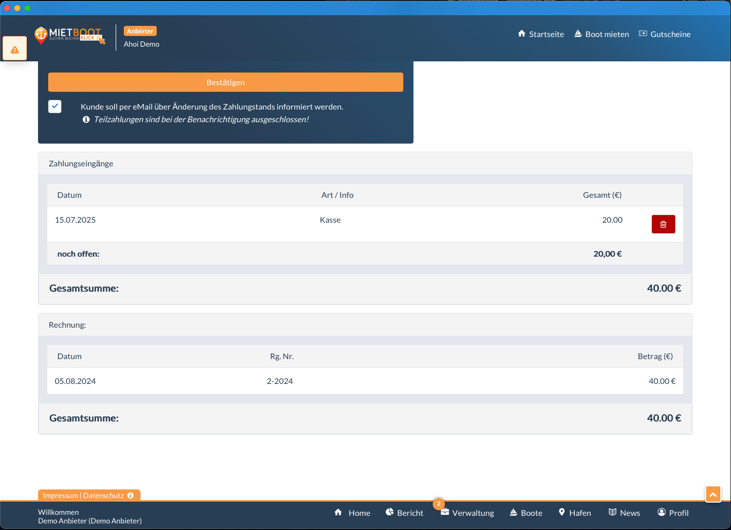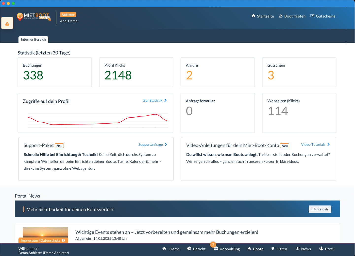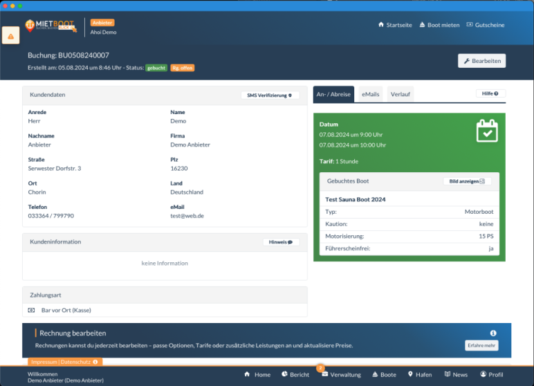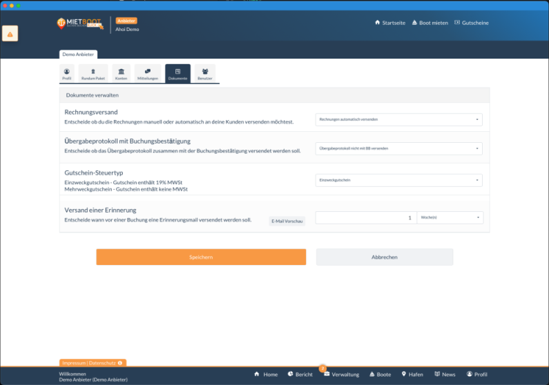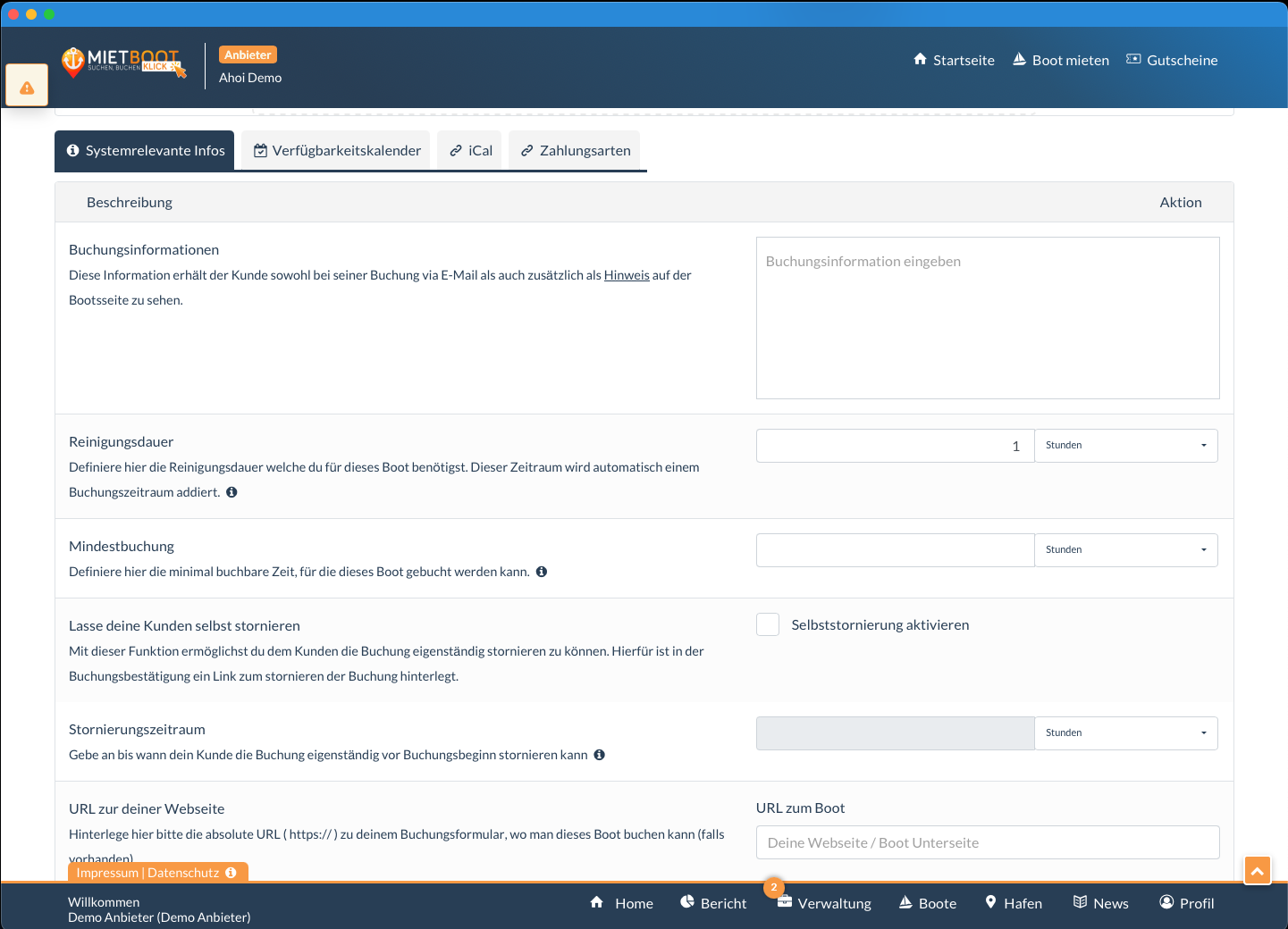 Ein vollständiges Anbieterprofil ist die Grundlage für eine erfolgreiche Präsentation deiner Boote auf Miet-Boot.de. Es sorgt nicht nur für Vertrauen bei deinen Kunden, sondern stellt auch sicher, dass alle buchungsrelevanten Prozesse reibungslos ablaufen – von der Rechnungserstellung bis zur Zahlung.