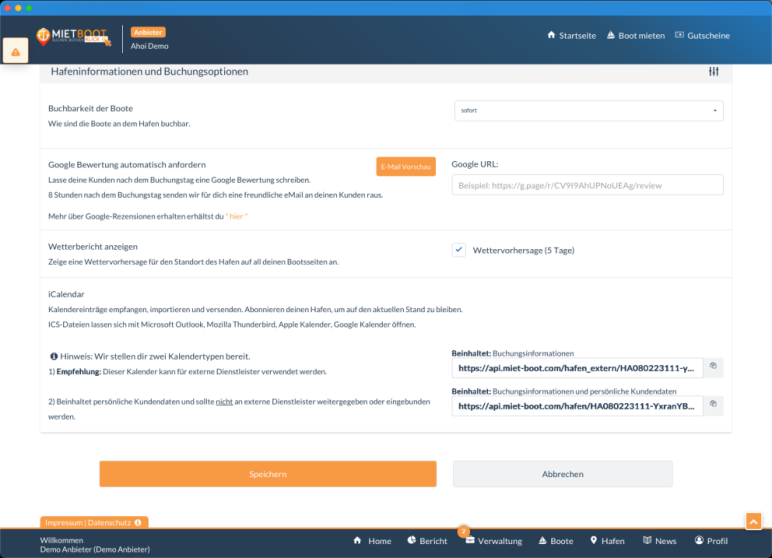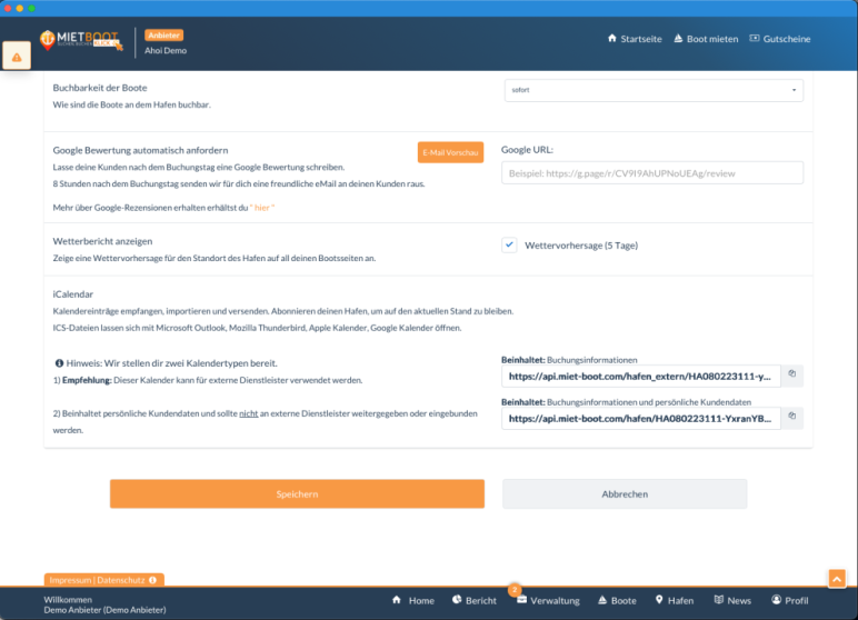 - Buchbarkeit und Zusatzfunktionen (Google Bewertung, Wetterbericht, iCal) aktivieren