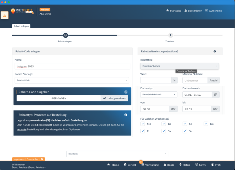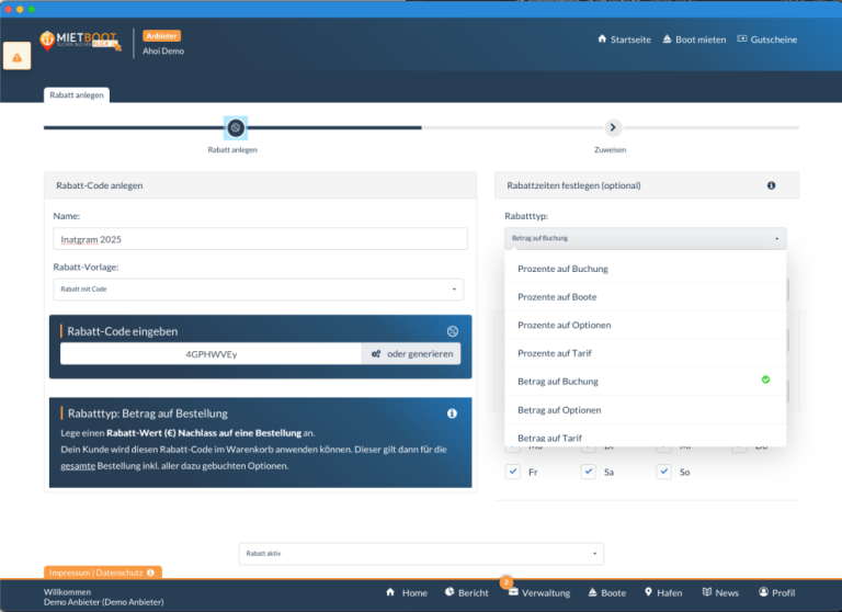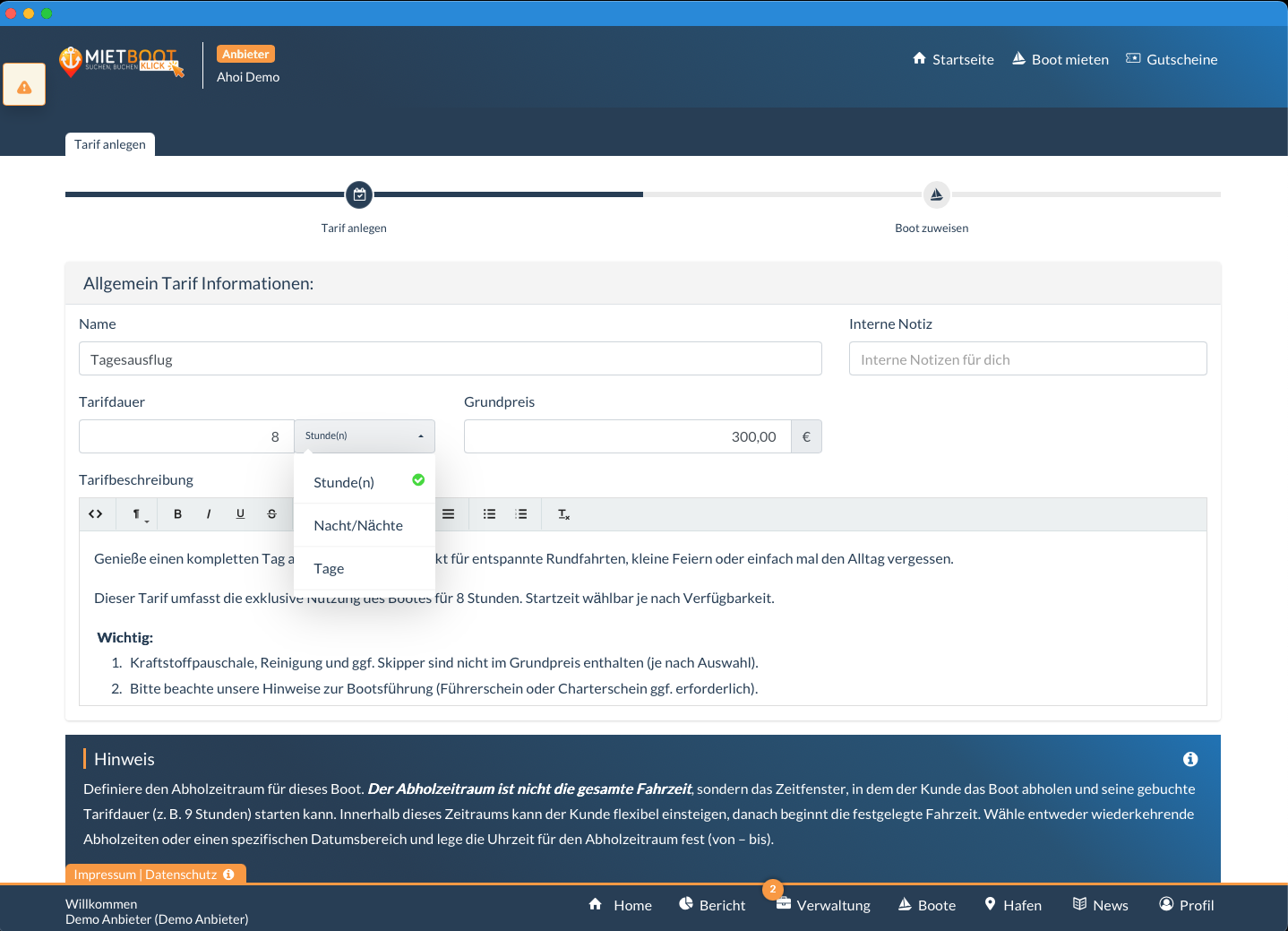 - Nachdem du deine Tarifdaten eingegeben hast, folgt der nächste Schritt „Boot zuweisen“.