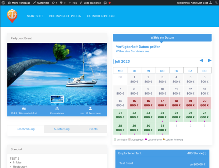 Nutze das WordPress-Plugin von Miet-Boot.de, um dein Buchungssystem direkt auf deiner eigenen Webseite einzubinden. So verhinderst du Doppelbuchungen und bietest deinen Kunden eine nahtlose Buchungserfahrung mit Live-Verfügbarkeit.
