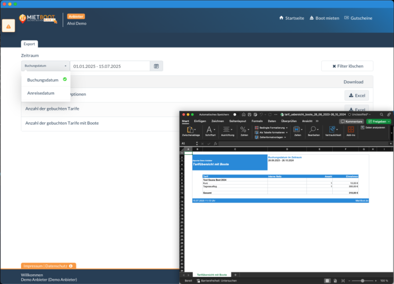- Unter „Exportieren“ kannst du die Anzahl gebuchter Optionen und Tarife als Excel-Dateien exportieren.
