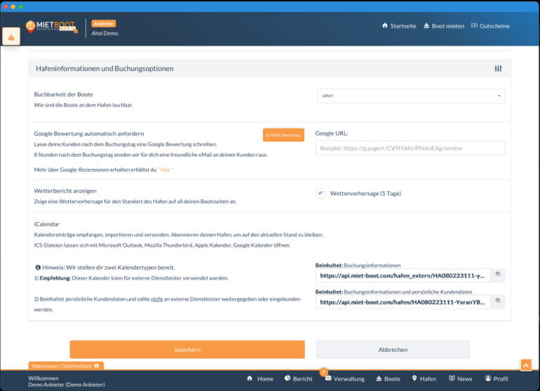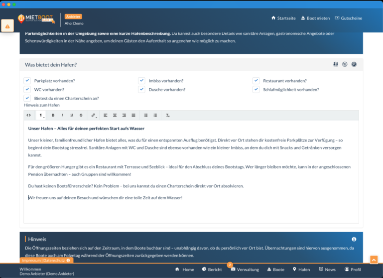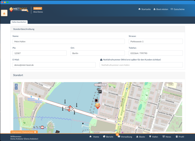 Jeder Anbieter kann beliebig viele Häfen anlegen – wichtig ist, dass jeder Standort mit einem echten Standort versehen wird. Nur so kann dein Angebot regional auffindbar sein und korrekt in Kalender, Rechnungen und Mails eingebunden werden.