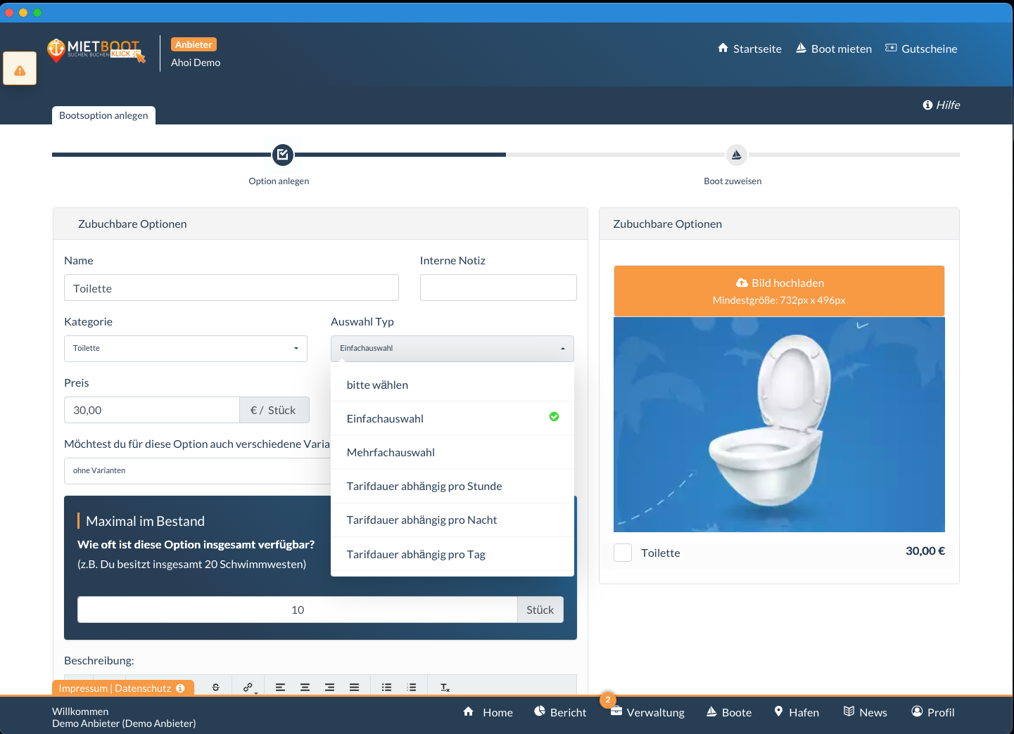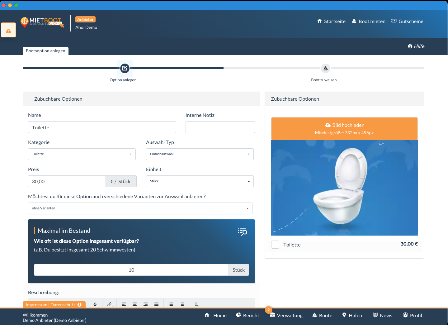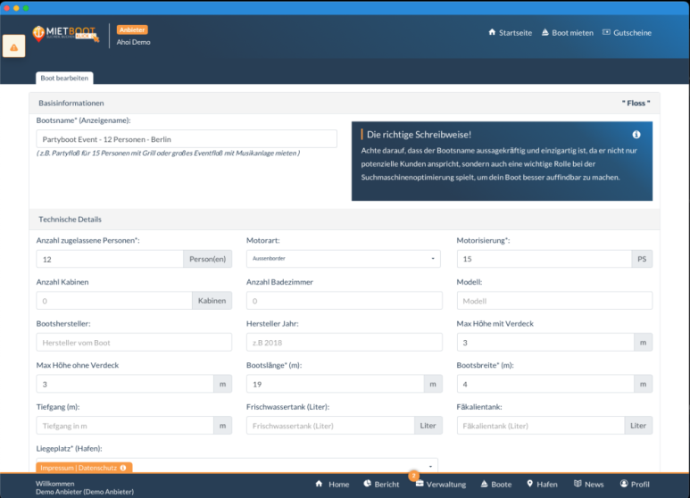 In diesem Schritt trägst du alle relevanten Informationen zu deinem Boot ein – von der Motorisierung bis hin zu Besonderheiten der Ausstattung. Diese Angaben sind entscheidend, damit Kunden dein Boot finden und buchen können.