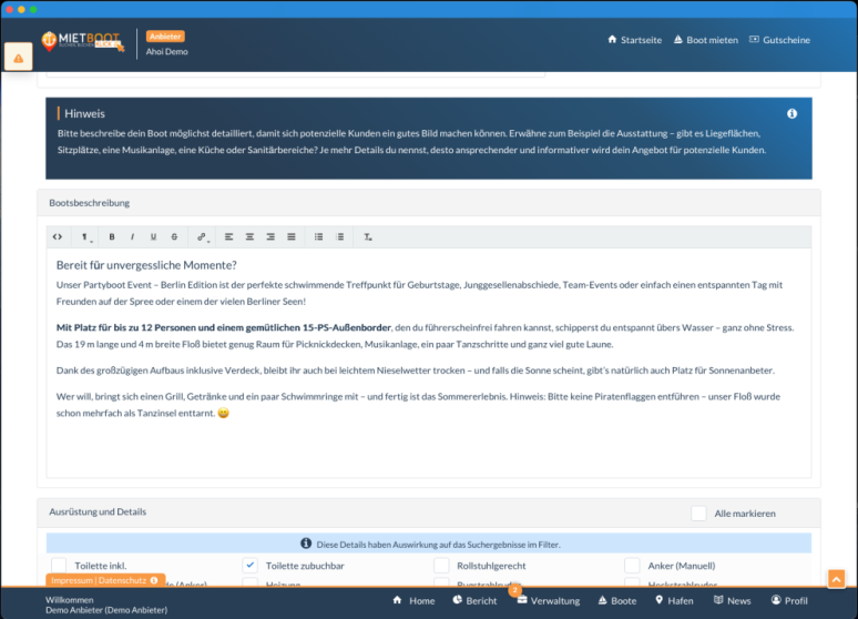 - Erstelle eine ausführliche, suchmaschinenoptimierte Beschreibung deines Bootes.