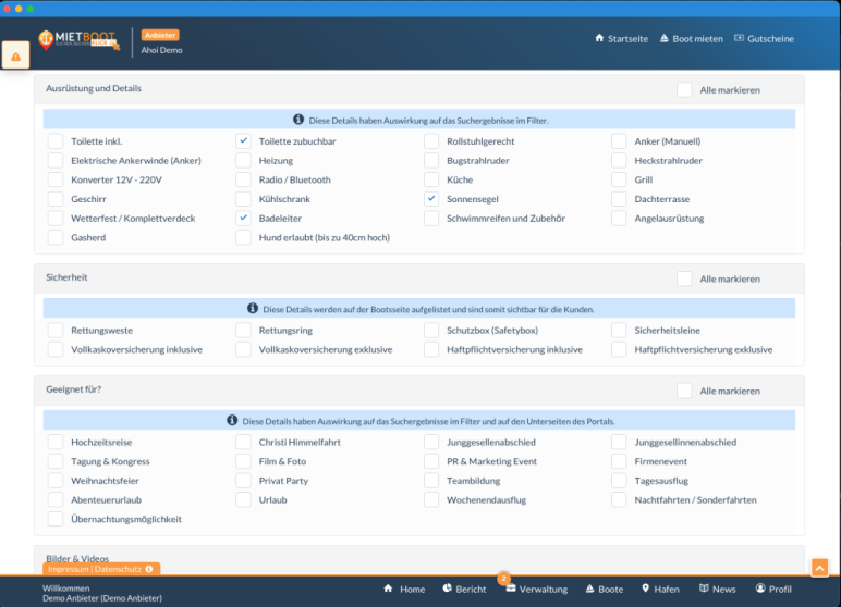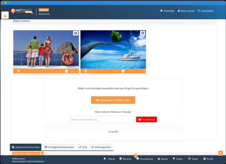 - Lade mehrere Bilder pro Boot hoch: Außenansicht, Innenraum, Technik, Ausstattung.