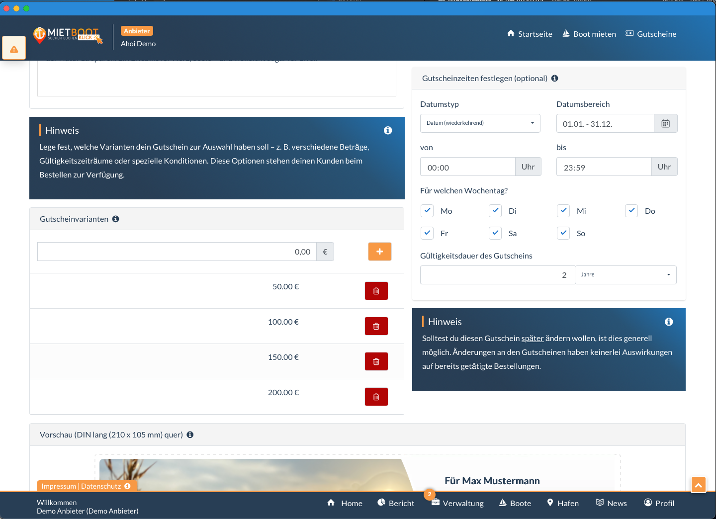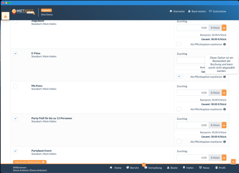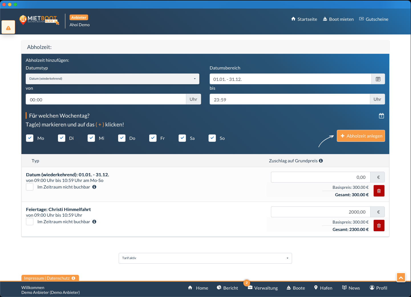 - Für jedes Boot kannst du individuell den Mindest-/Maximalwert und einen Zuschlag hinterlegen.