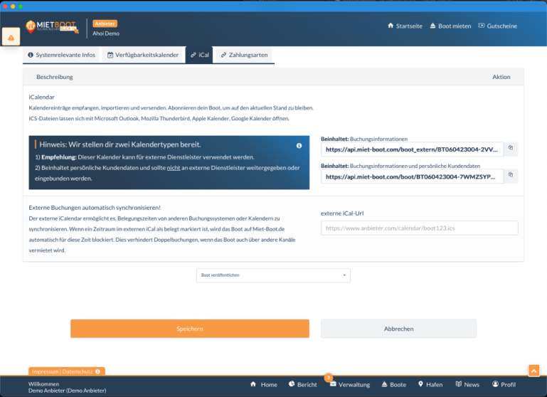- Wähle „Boot bearbeiten“ und scrolle zum Reiter „iCal“.