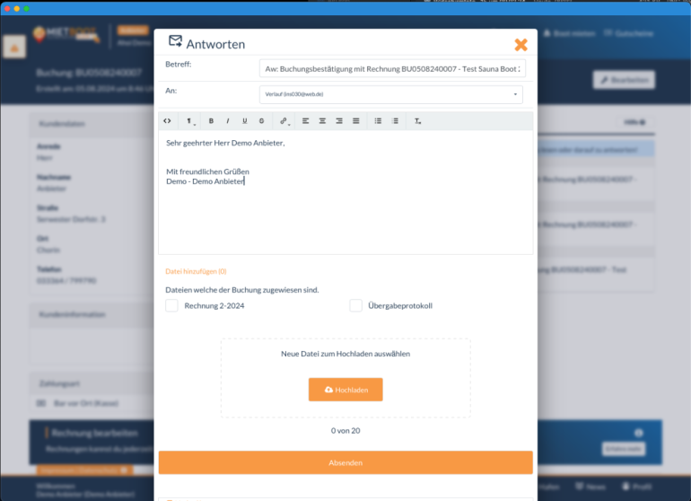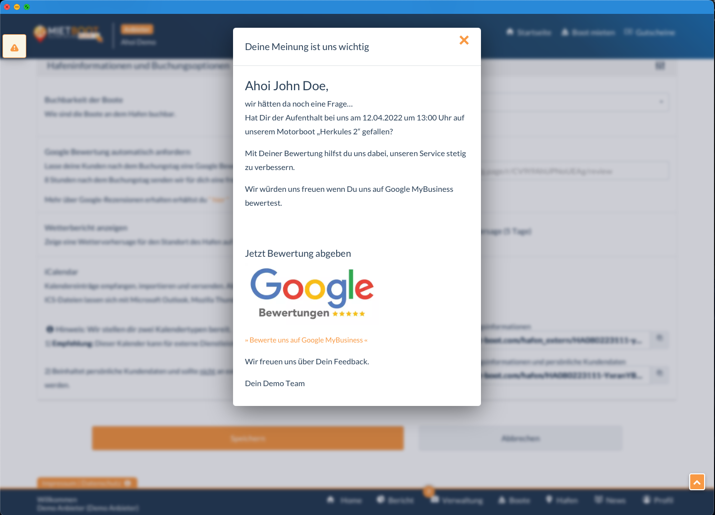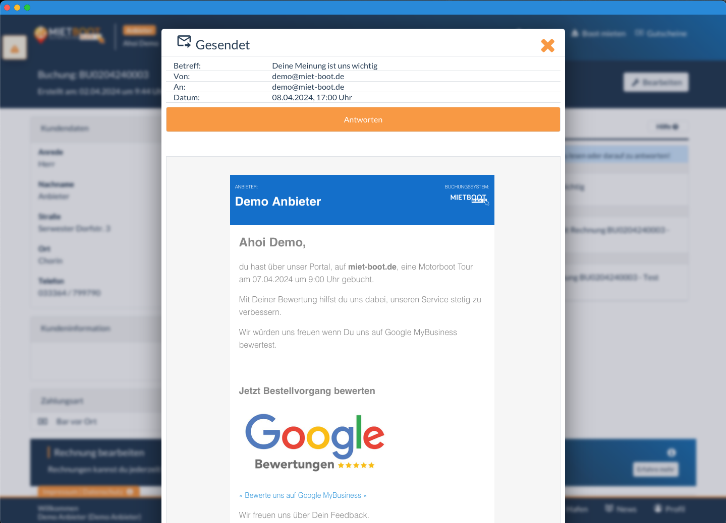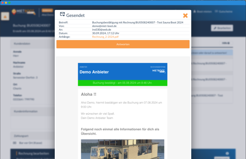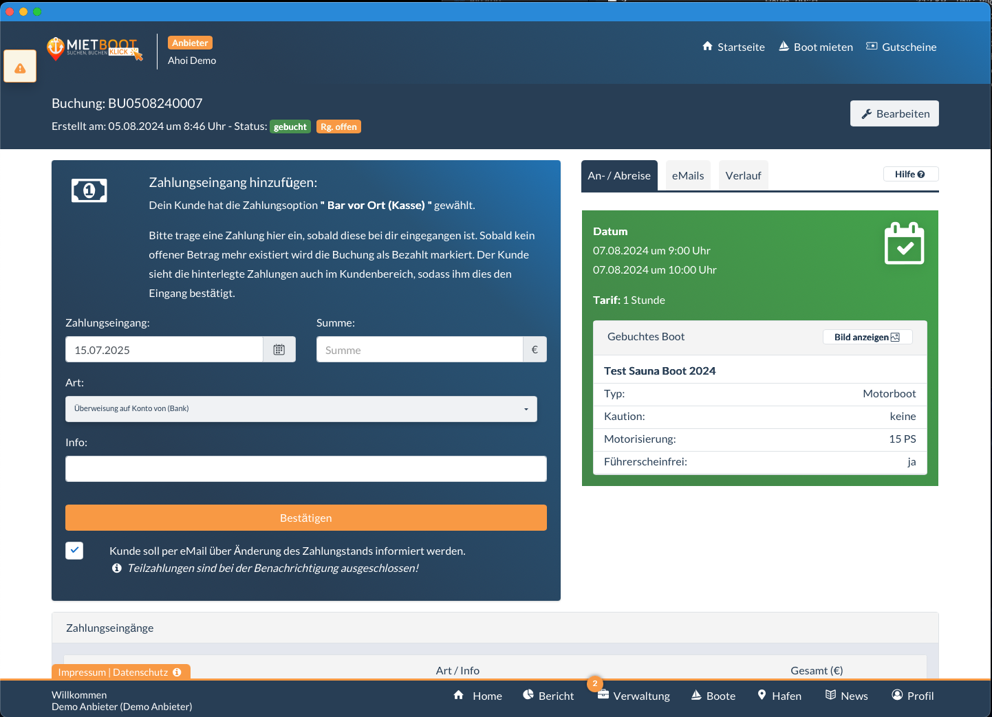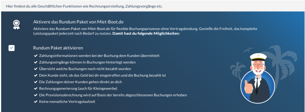 Aktiviere das Buchungssystem, um alle Vorteile der automatisierten Abwicklung auf Miet-Boot.de zu nutzen. Dazu zählen direkte Zahlungsinformationen, automatische Rechnungserstellung und SMS-Verifizierung deiner Kunden.