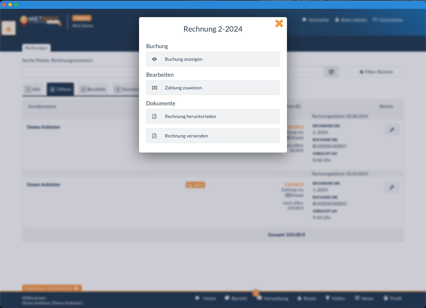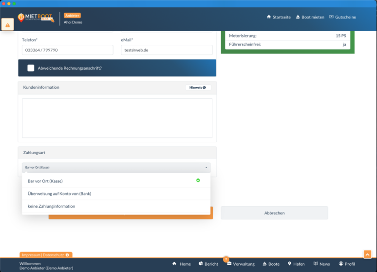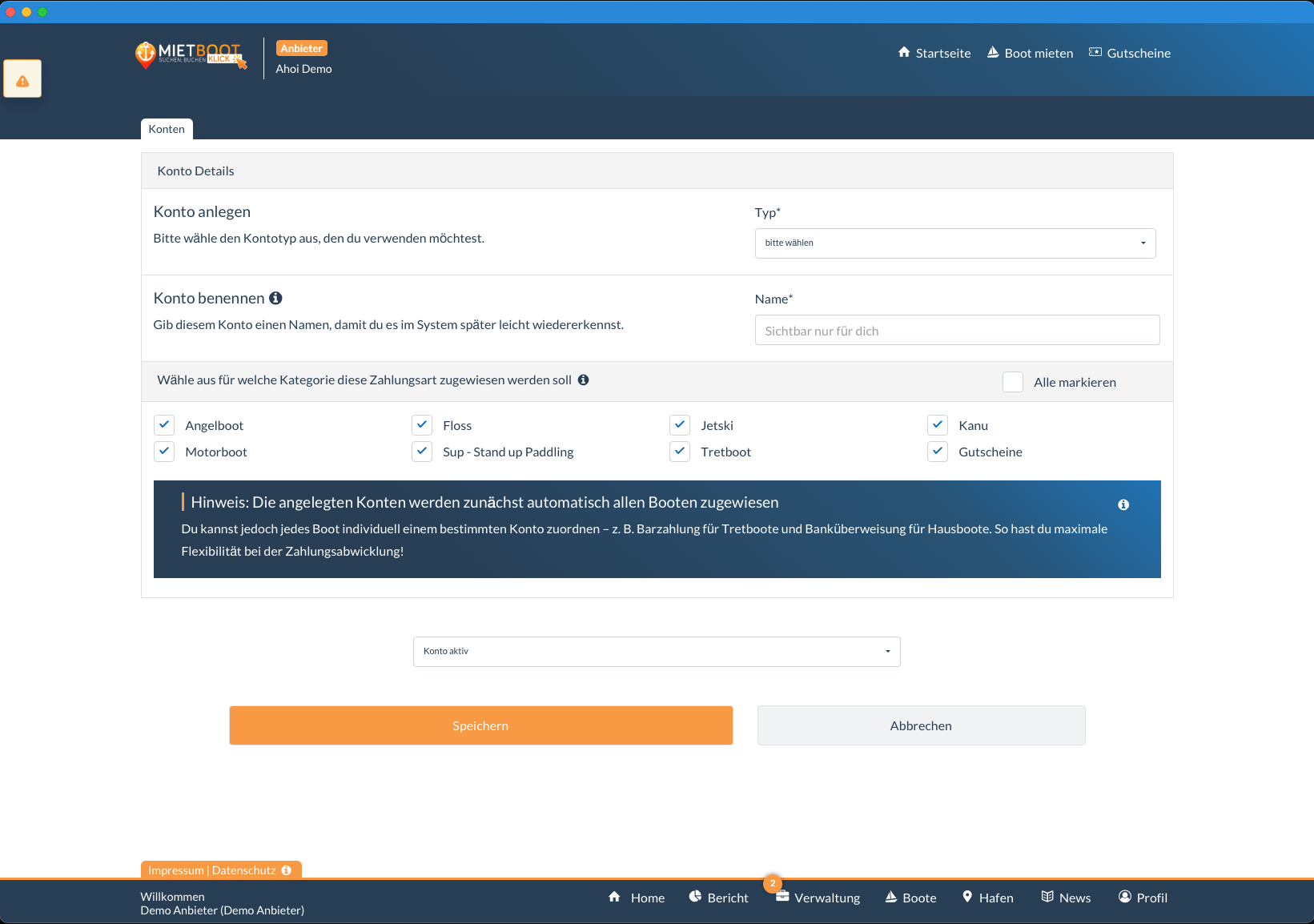 Lege deine bevorzugten Zahlungsarten an und weise sie Bootskategorien zu. So stellst du sicher, dass Kunden immer passende Optionen zur Auswahl haben.