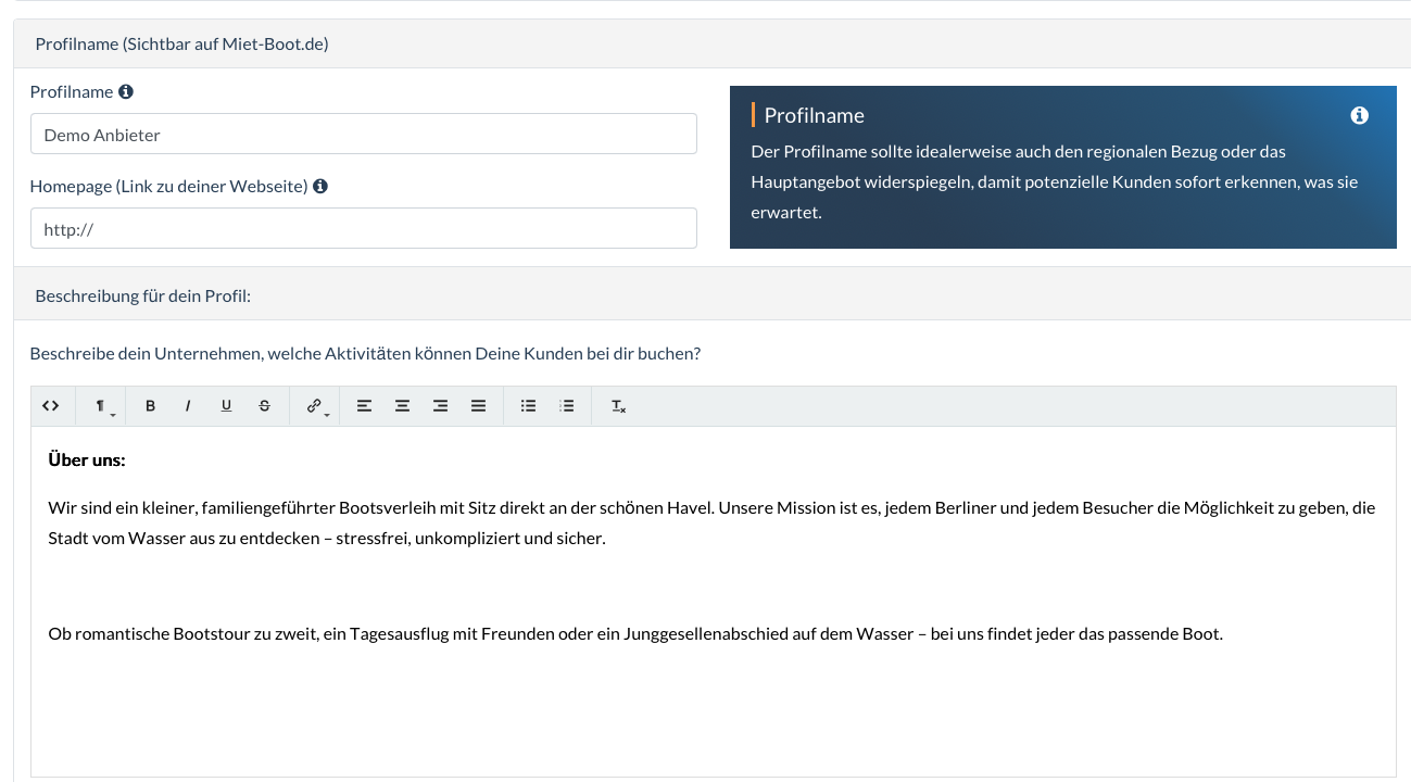 Der Profilname wird auf Miet-Boot.de angezeigt. Er sollte regionalen Bezug haben oder dein Hauptangebot widerspiegeln. Achte auf einen klaren, professionellen Eindruck.