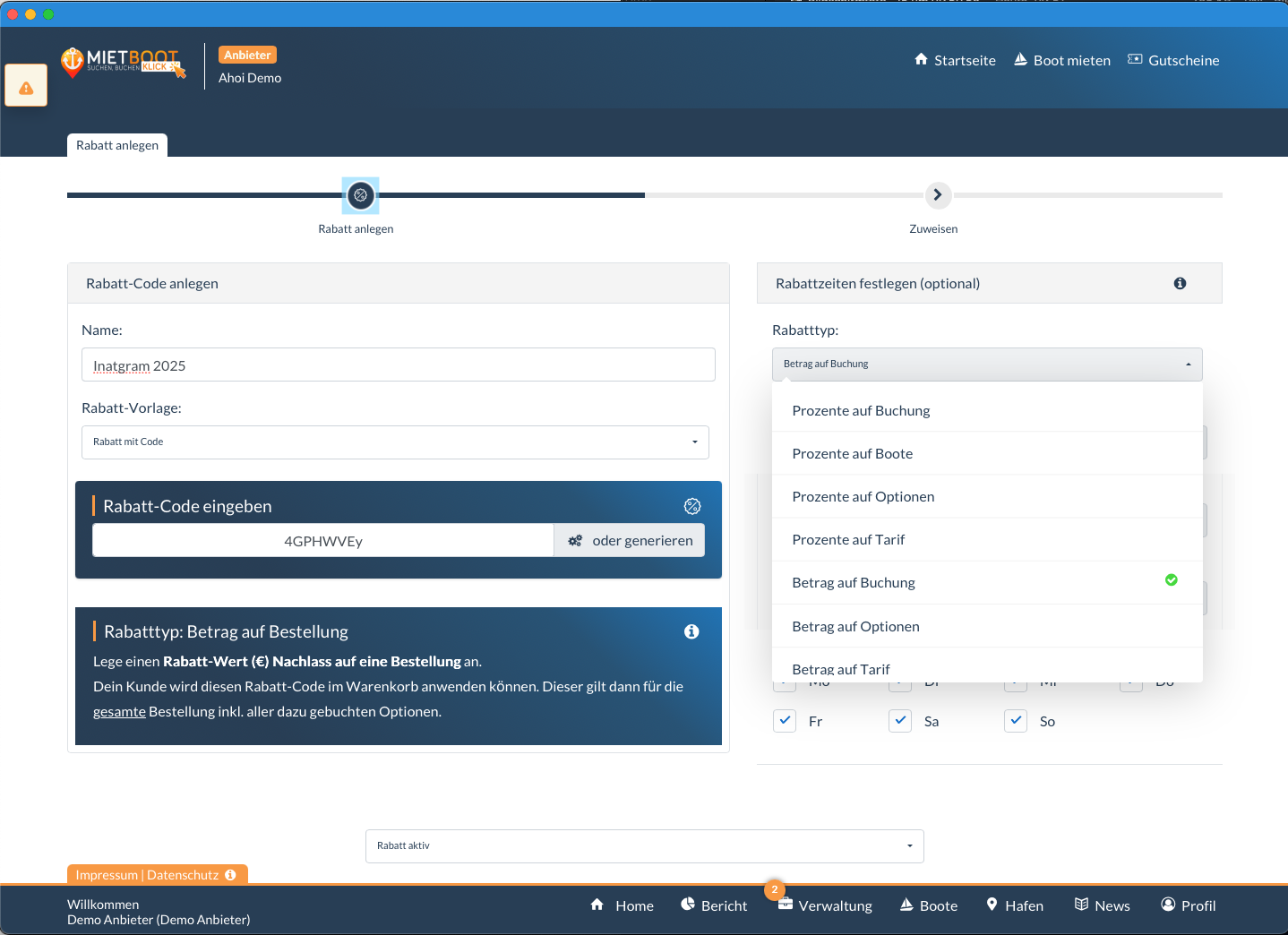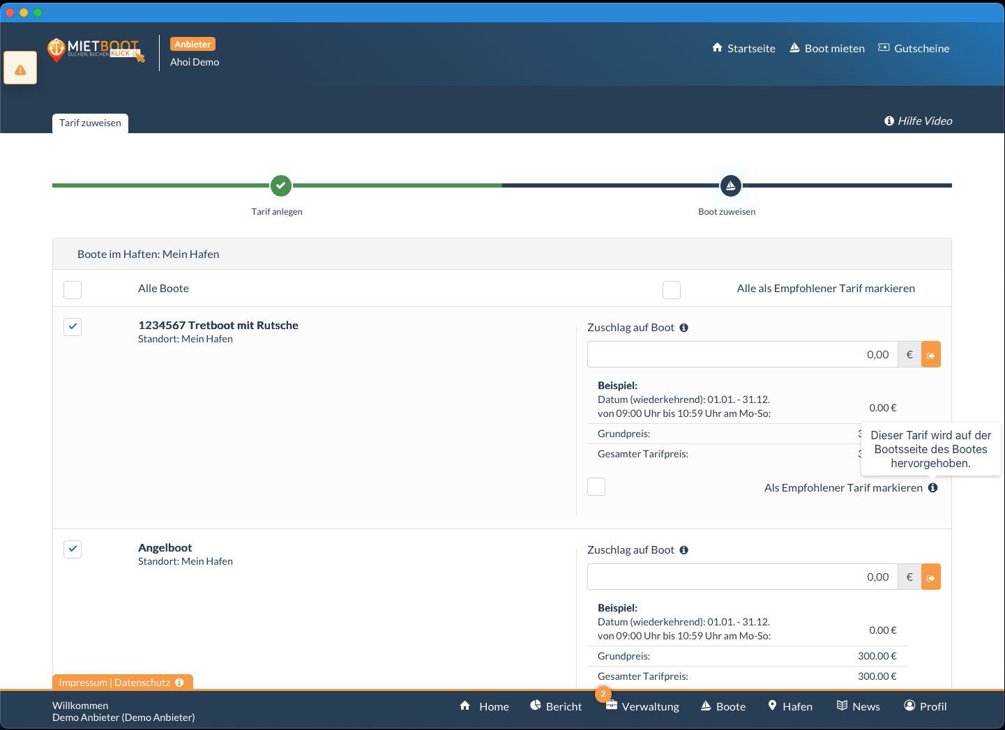 Im letzten Schritt musst du den neu angelegten Tarif einem oder mehreren Booten zuweisen. Erst nach der Zuweisung ist der Tarif aktiv und für Buchungen verfügbar.