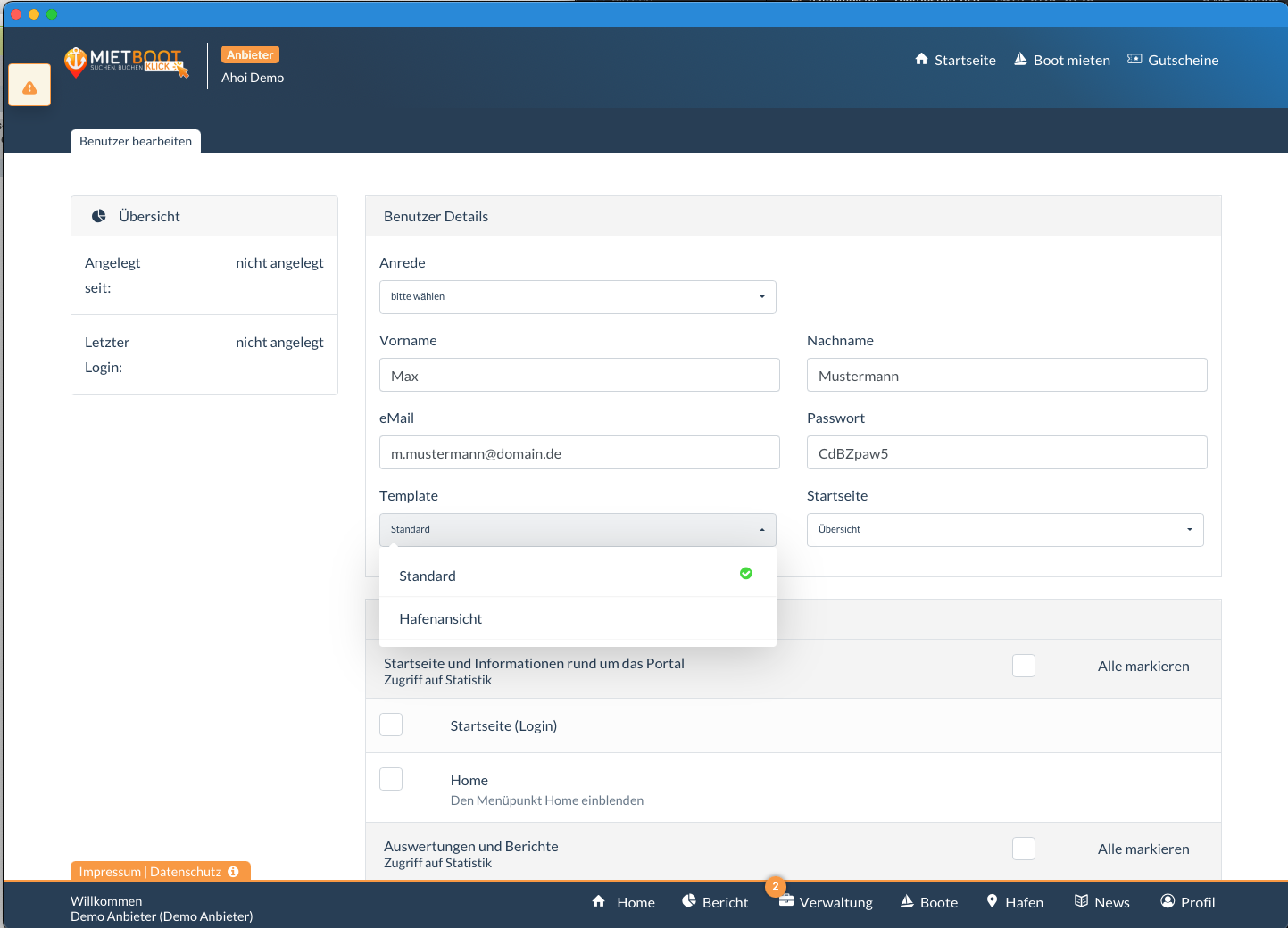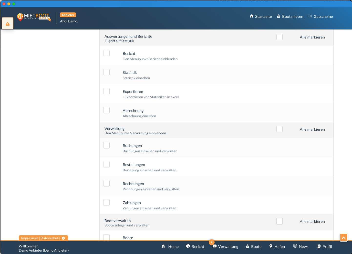 - Lege fest, auf welche Bereiche der Benutzer Zugriff haben soll – z. B. nur Buchungen, Berichte oder die Hafenansicht.