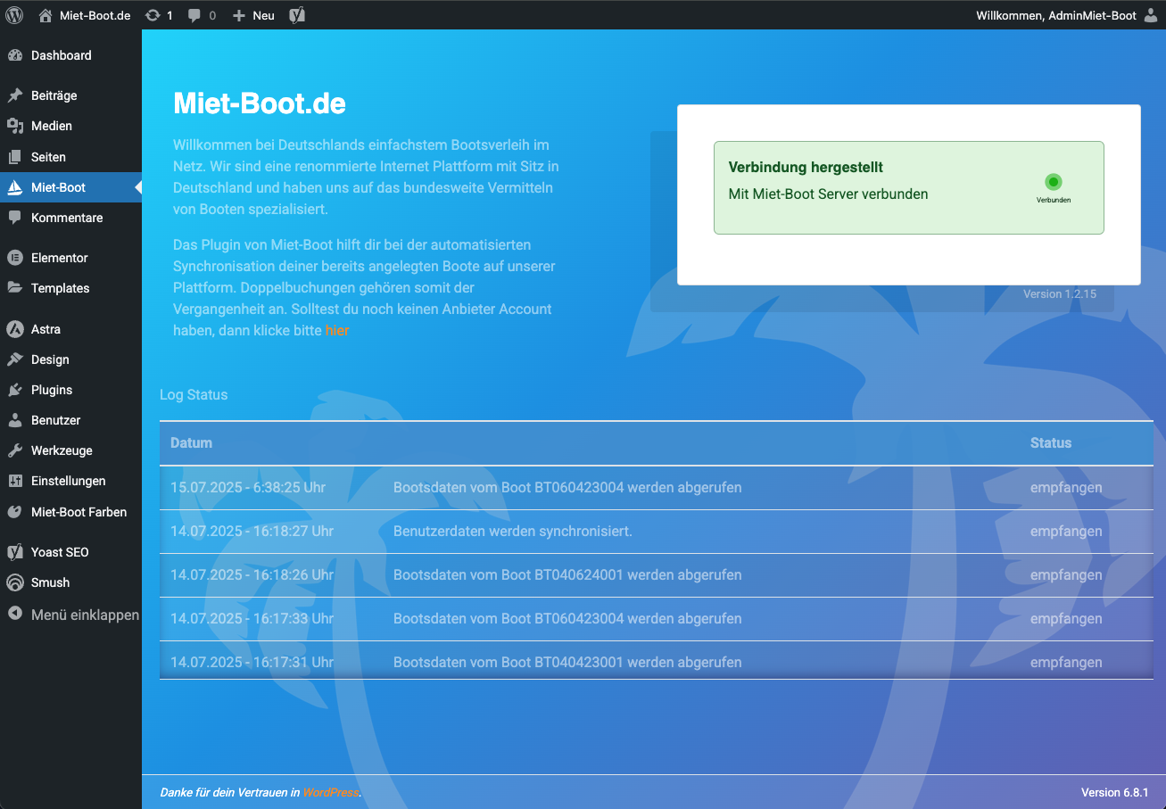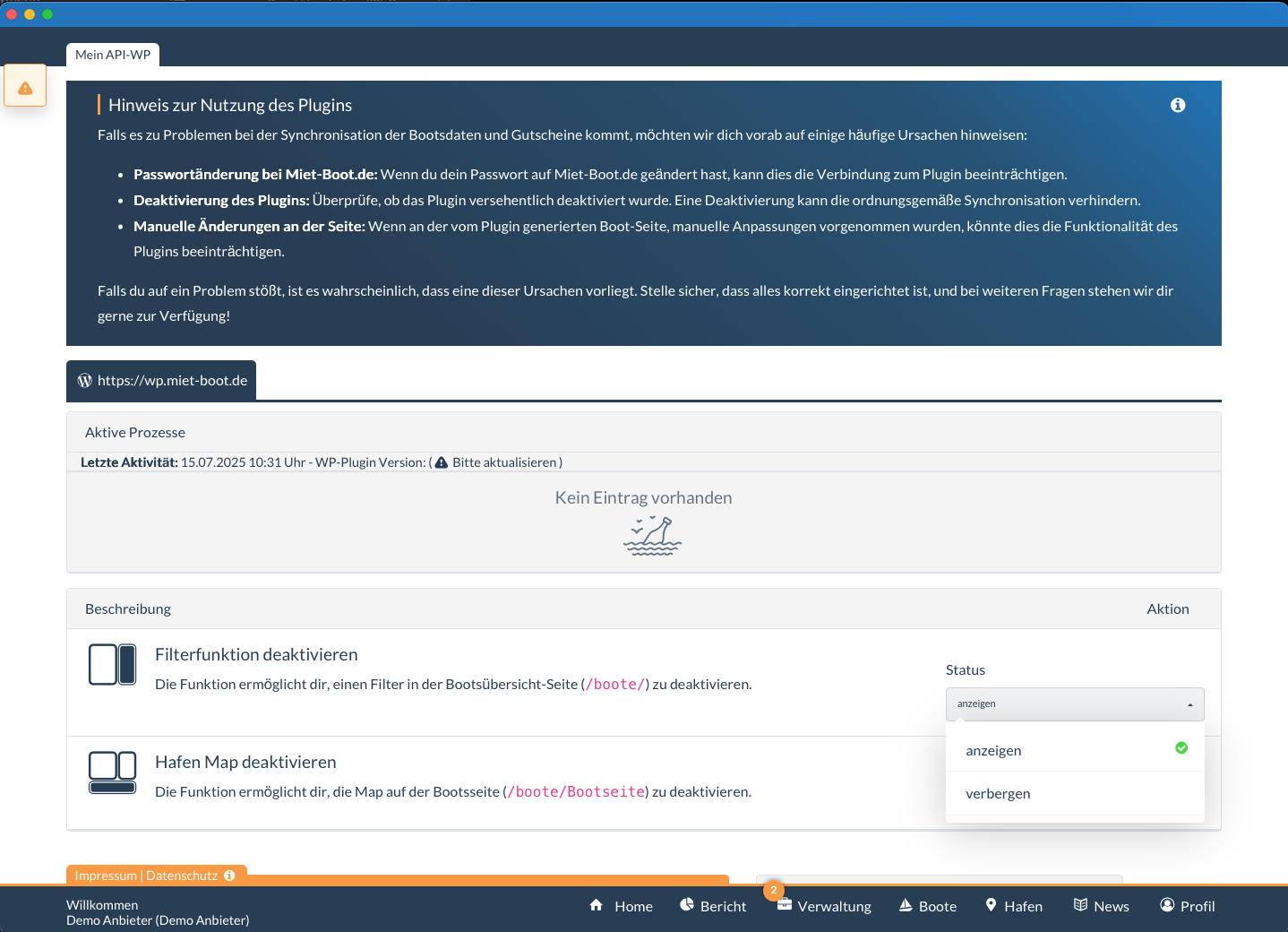Alle Inhalte bleiben auf Miet-Boot.de – es werden keine fremden Daten in dein System geschrieben. Das Plugin übernimmt lediglich die Anzeige und Integration deines Profils.