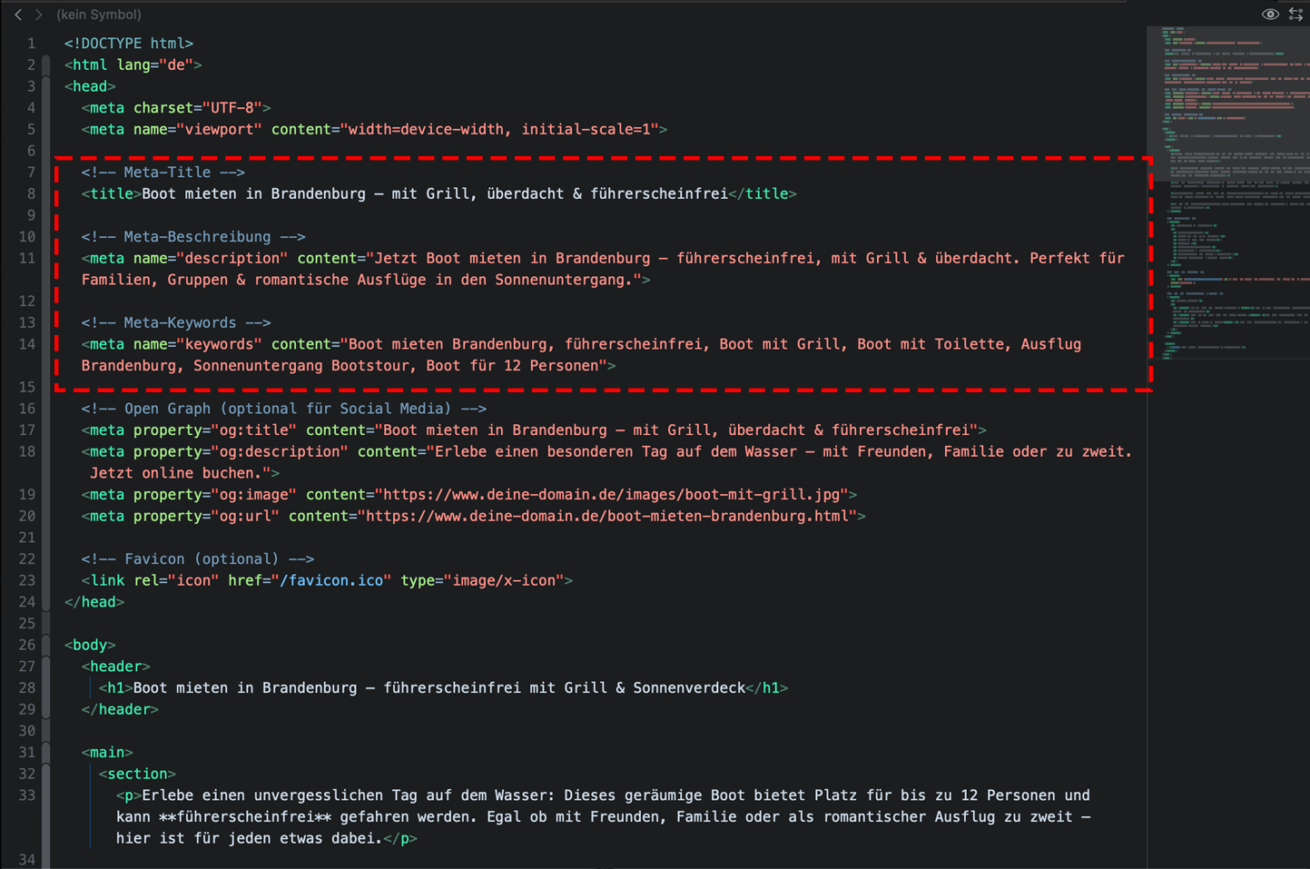 - Keywords: Begriffe, nach denen Kunden suchen – z. B. „Boot mieten Berlin“, „führerscheinfrei“, „Toilette an Bord“.