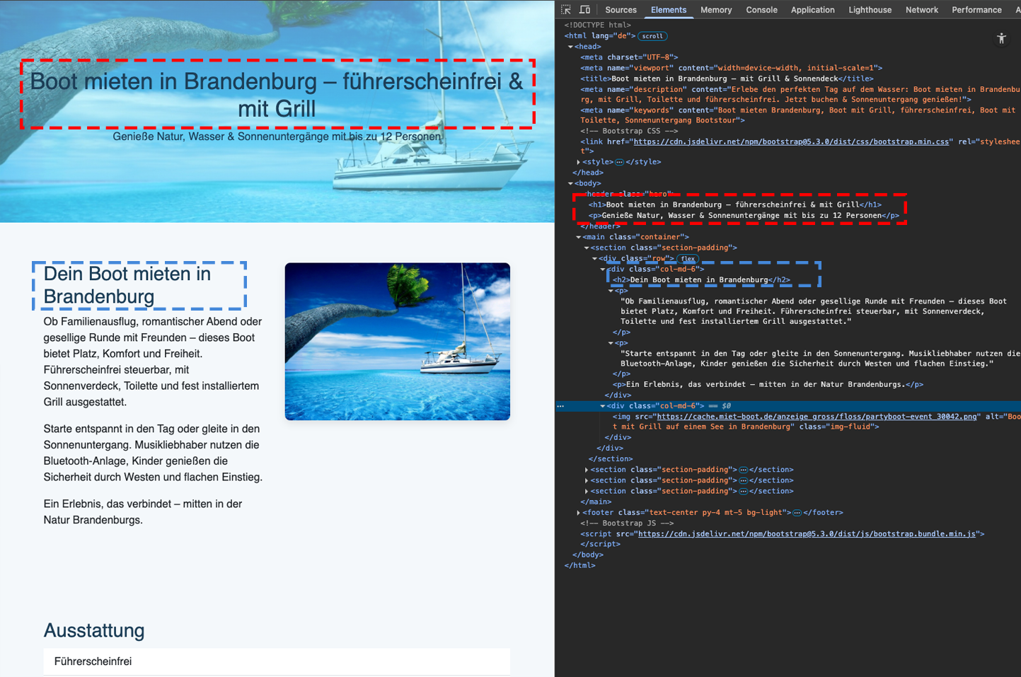- H1-Überschrift: Die Hauptüberschrift der Seite – sollte ebenfalls ein wichtiges Keyword enthalten.