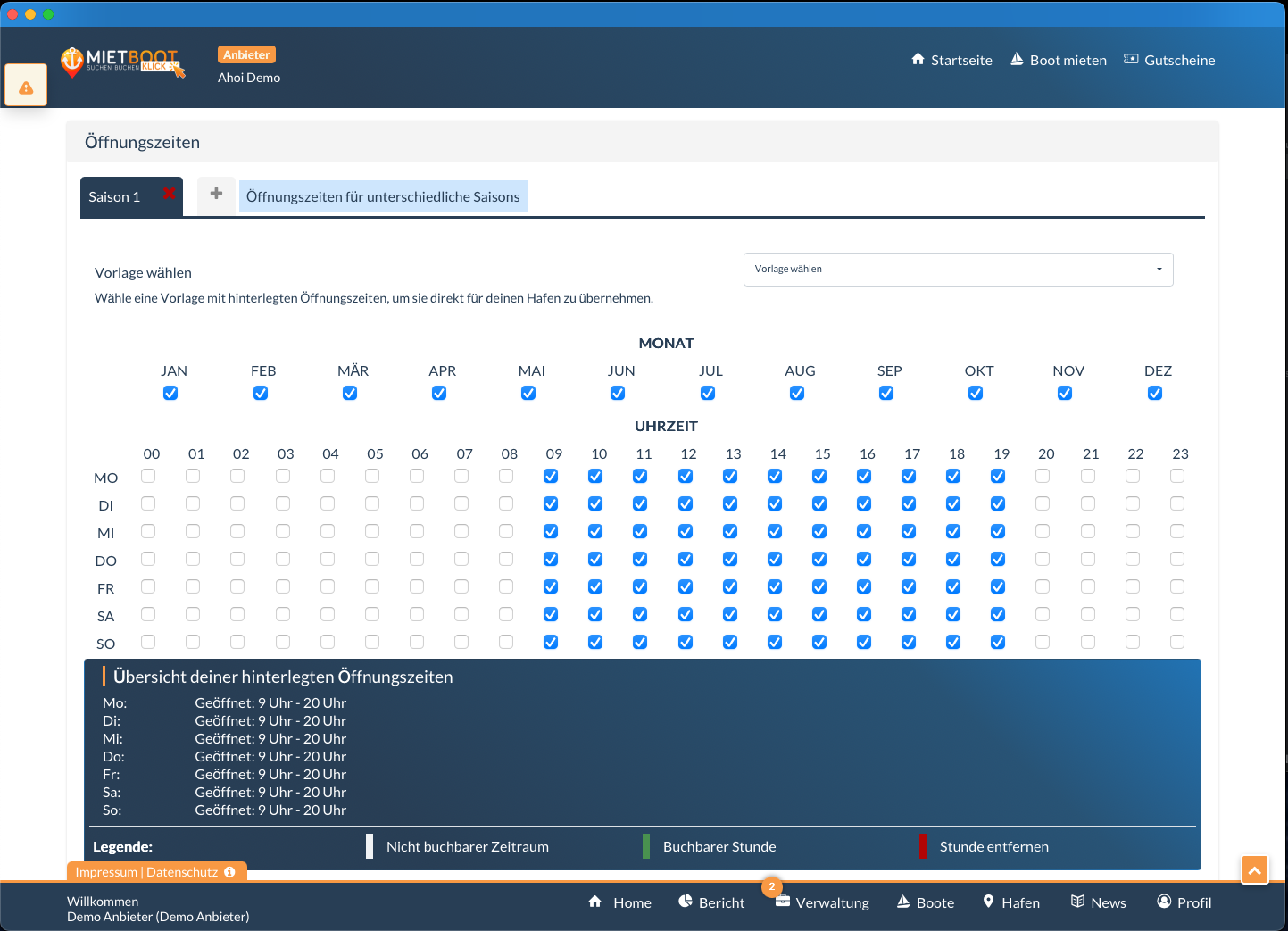 - Öffnungszeiten nach Wochentagen und Saison festlegen