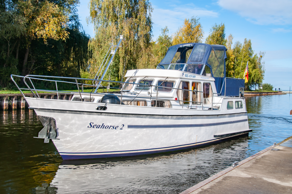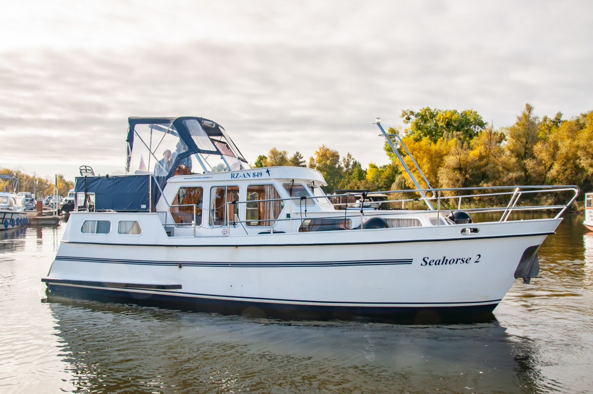 Die Hollandia 1000S hat eine klassisch weißer Yachtlackierung. Mit ihrem großzügigen Platzangebot ist das Schiff ideal für zwei Paare oder eine vierköpfige Familie. Das warme Ambiente des Mahagoni-Innenausbaus, die gemütlichen Salonpolster und gemeinsames Speisen in der Küchensitzgruppe sprechen für sich – einfach komfortabler Bootsurlaub. Nicht nur Kinder werden ihren Spaß auf der Badeplattform haben, während Sonnenanbeter auf dem einladenden Achterdeck voll auf ihre Kosten kommen. Dabei ist maritimes Fahrvergnügen unabhängig vom Wetter voll gewährleistet.