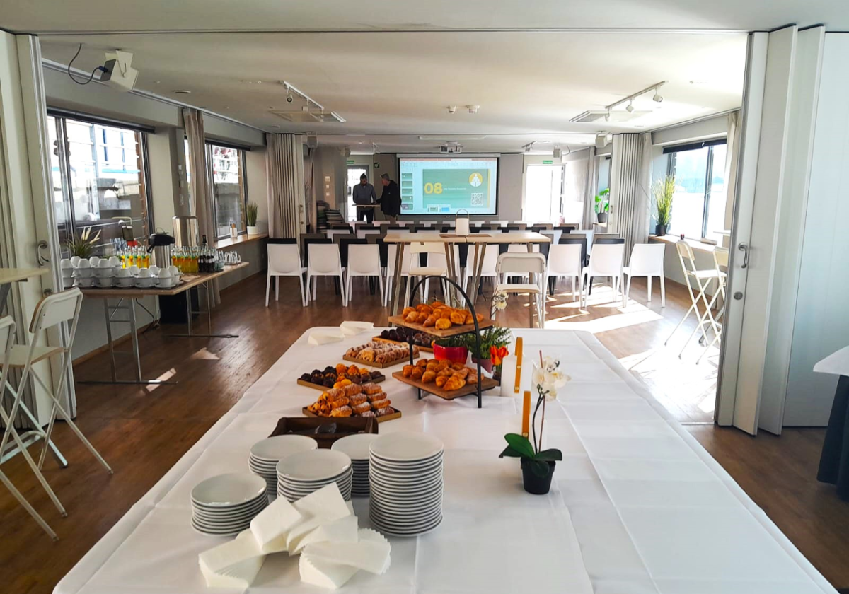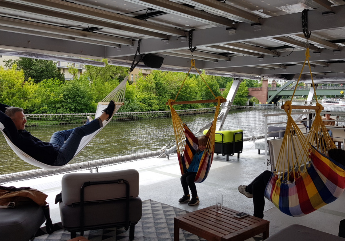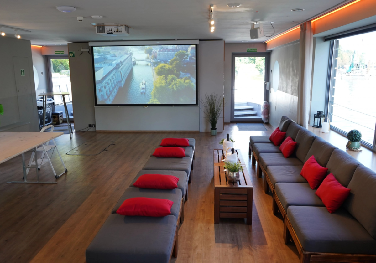 Es gibt einen 160 m² großer Veranstaltungsraum, der sich mit mobilen Trennwänden in bis zu drei Räume aufteilen lässt und bis zu 200 Personen Platz bietet. Außerdem steht Euch eine 200 m² große Dachterrasse zur Verfügung. Im Sommer kann das Schiff an schönen Stellen mittels der integrierten Ankerpfähle stehen bleiben. Ideal für den Badestopp oder das Dinner bei Sonnenuntergang vor der Pfaueninsel. Winter: Das Schiff ist beheizt und lädt auch im Winter zu einer Bootstour ein.